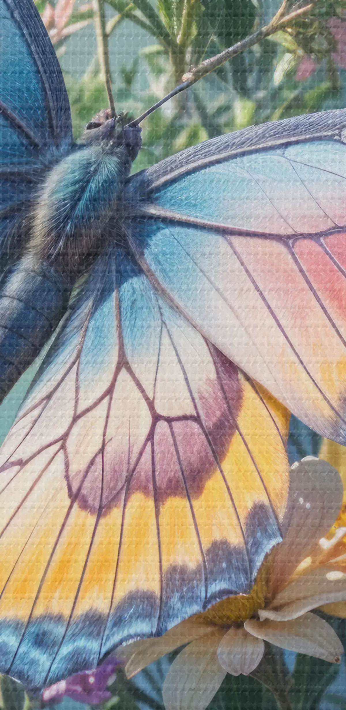 Quadri Una grande e colorata farfalla appollaiata su un mazzo di fiori rosa e gialli su uno sfondo verde scuro Nr s40411