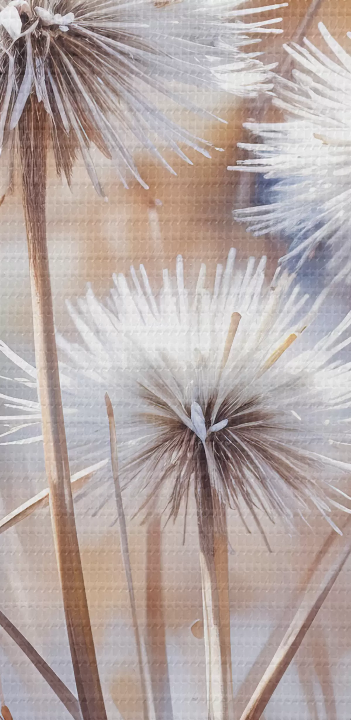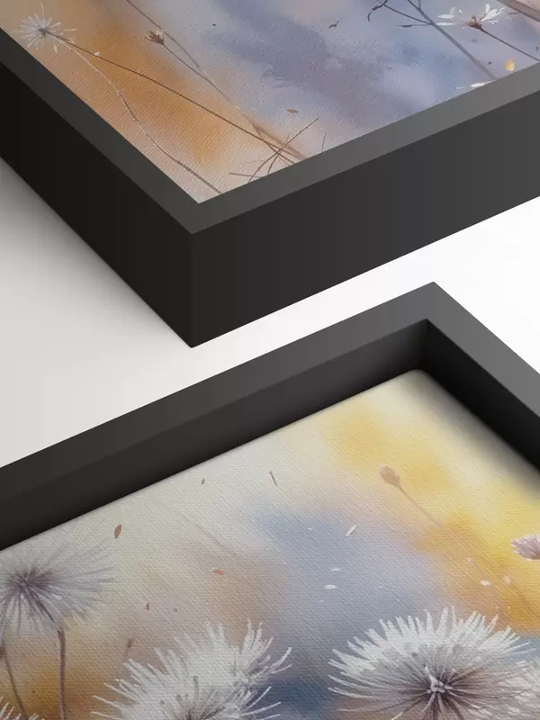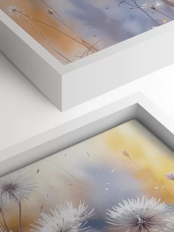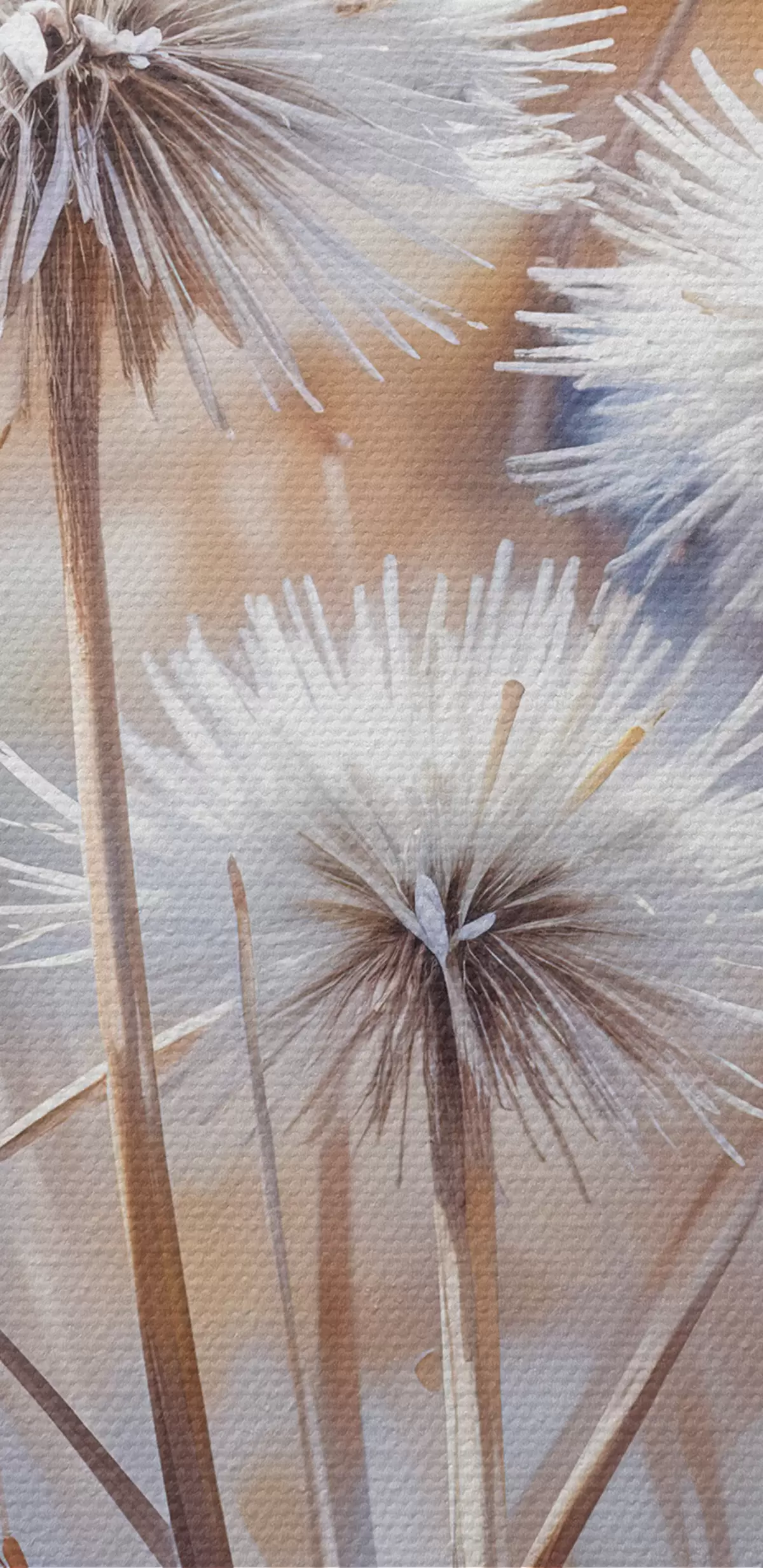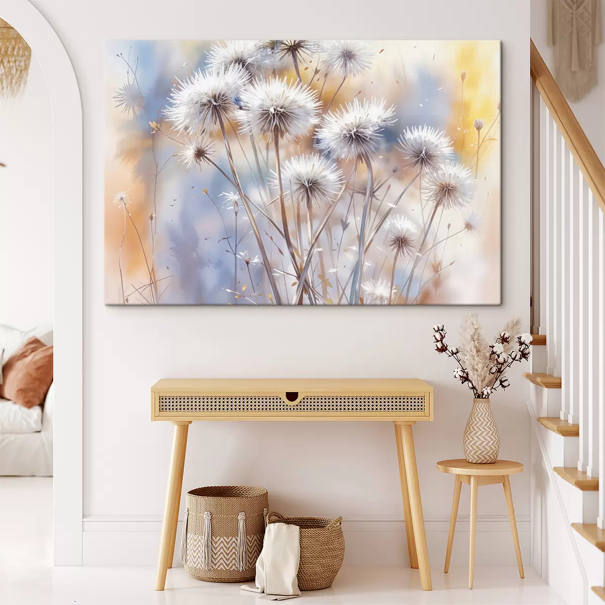 Quadri Soffici fiori bianchi di tarassaco su uno sfondo acquerello sfocato con luci calde Nr s40541