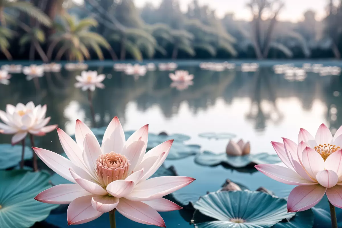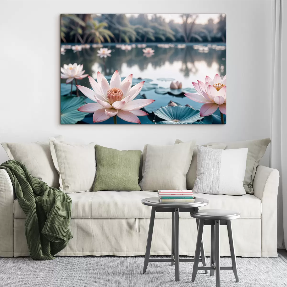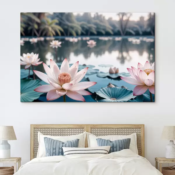 Quadri Uno stagno con fiori di loto rosa che galleggiano sulla superficie, circondato da una vegetazione lussureggiante e palme Nr s40555
