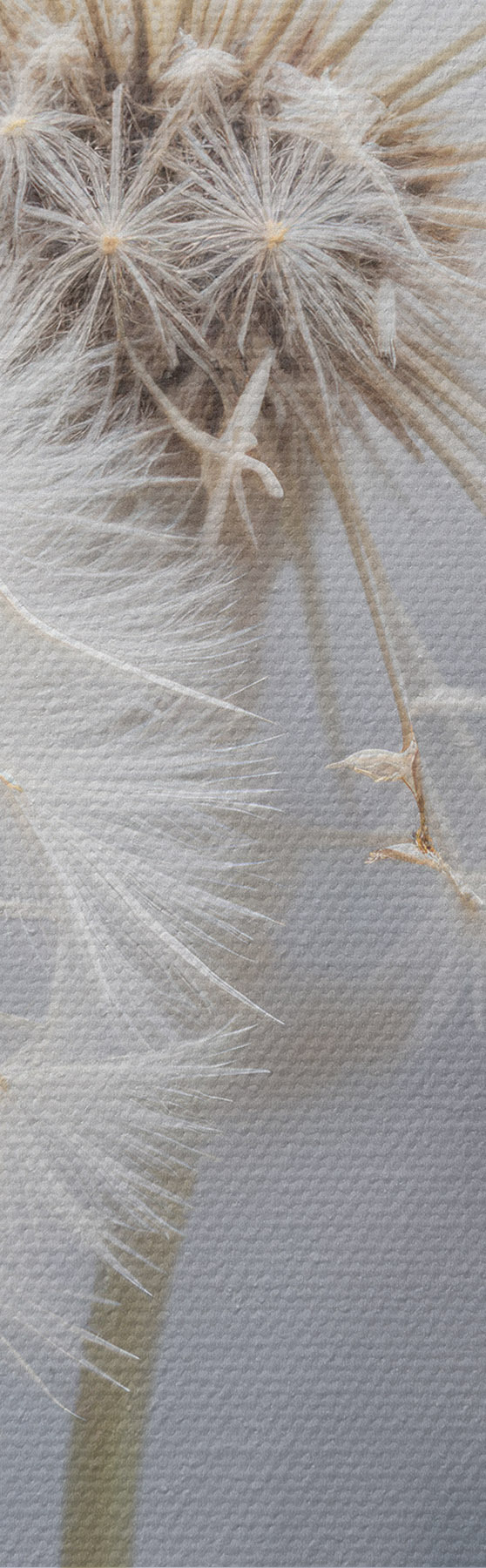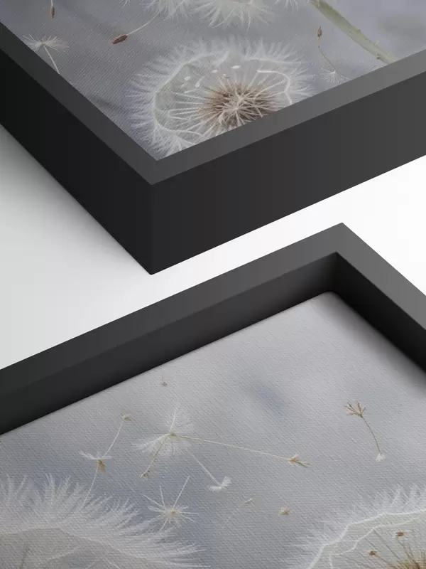Quadri Fiori bianchi di tarassaco con semi soffici su uno sfondo grigio sfocato Nr s40556