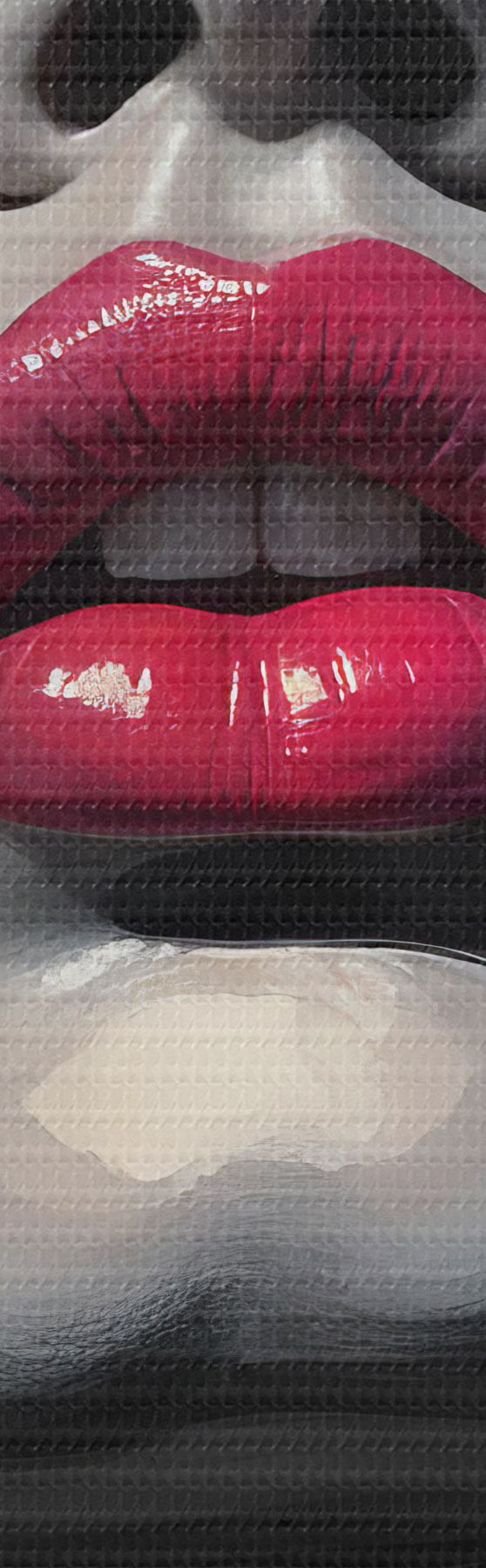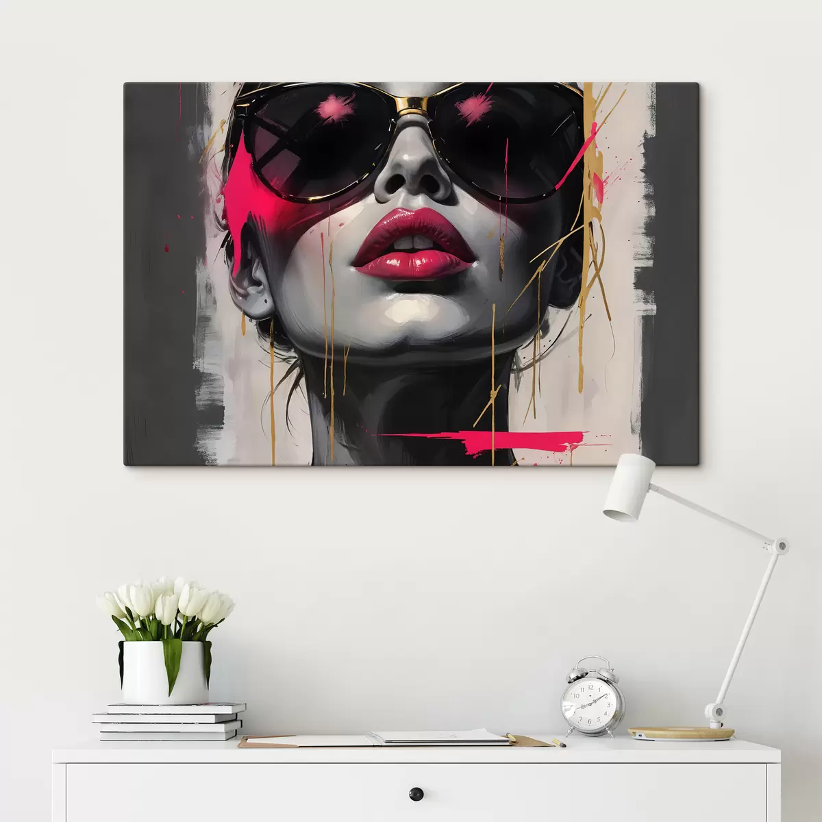 Quadri Ritratto astratto di una giovane donna con occhiali da sole, labbra rosa, forme astratte e spruzzi di rosa Nr s40558