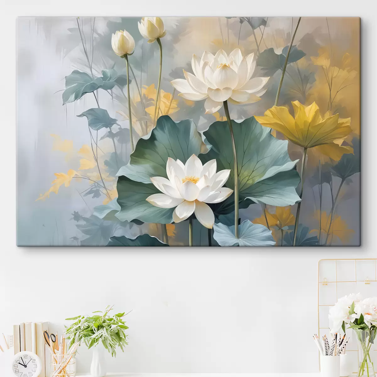 Quadri Fiori di loto bianchi in uno stagno con ninfee verdi, circondati da fiori gialli e uno sfondo sfocato Nr s40559
