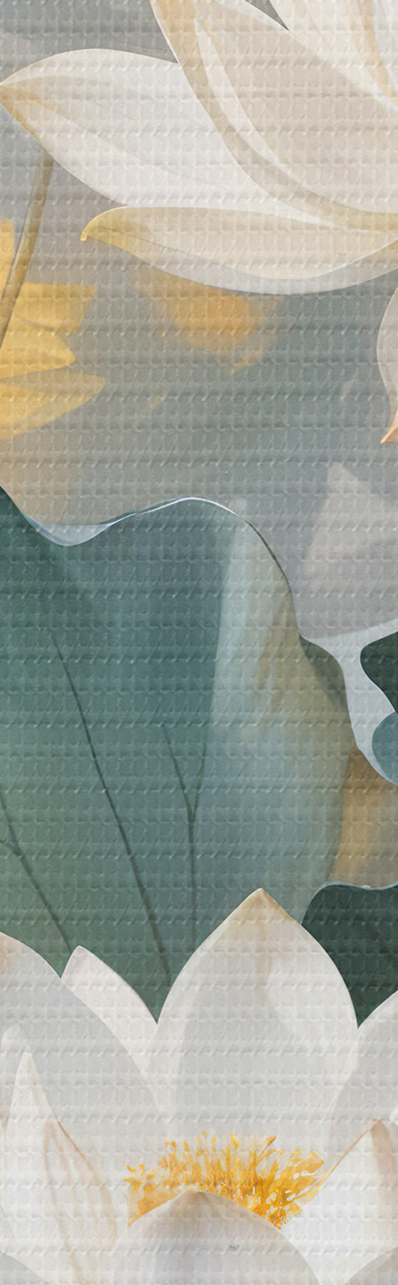 carta da parati Fiori di loto bianchi in uno stagno con ninfee verdi, circondati da fiori gialli e uno sfondo sfocato nr. s40559