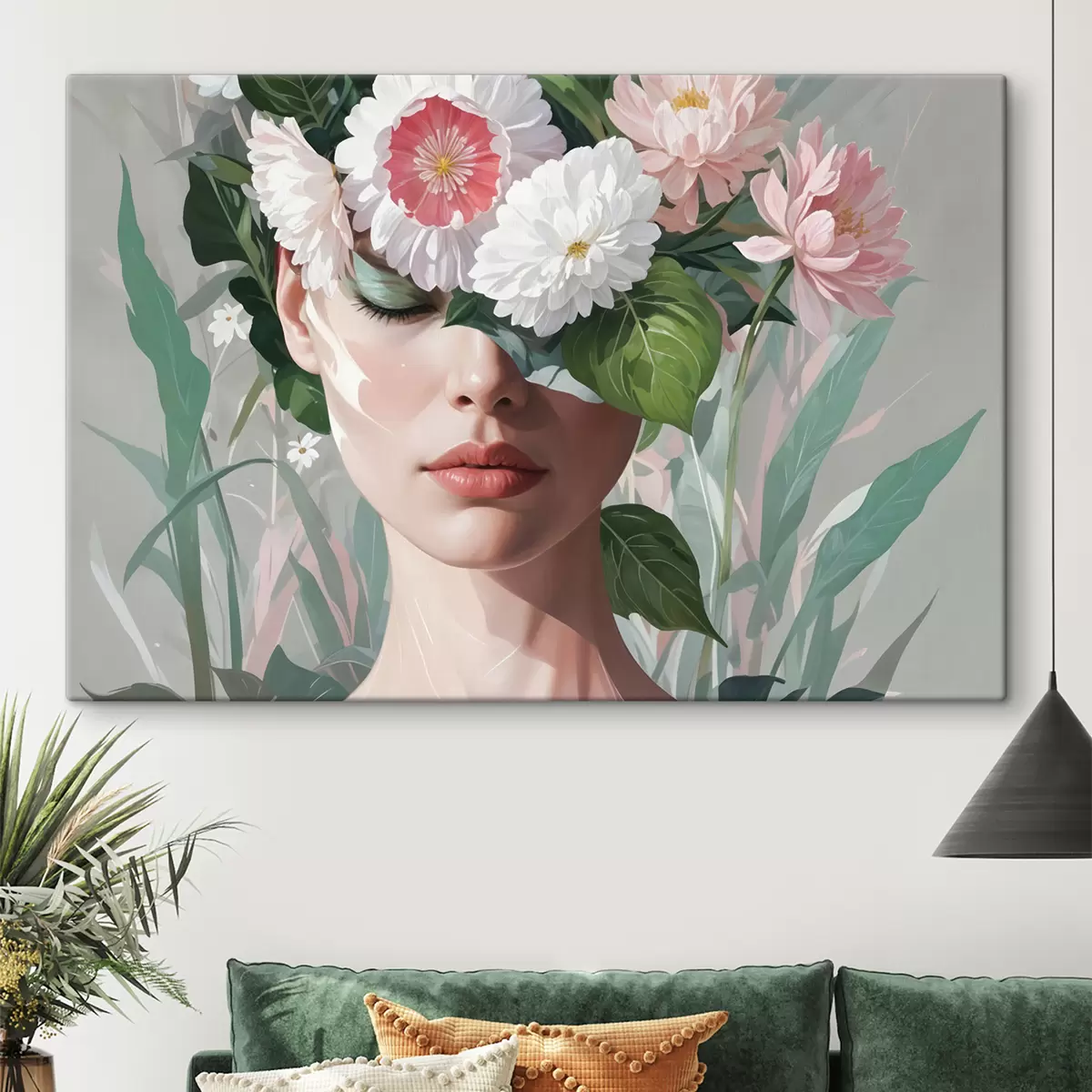 Quadri Una donna parzialmente nascosta da un bouquet di grandi fiori rosa e bianchi su uno sfondo verdeggiante e frondoso Nr s40567