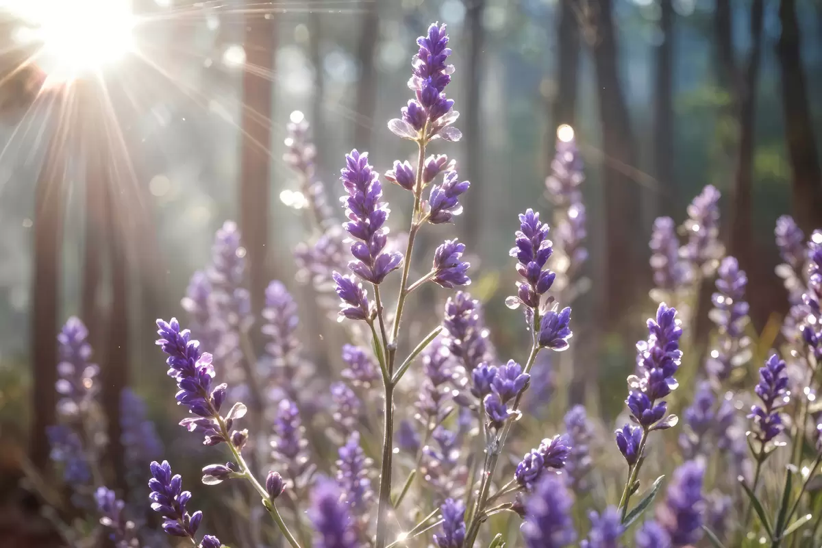 carta da parati Fiori di lavanda viola in un campo, con uno sfondo sfocato della foresta e la luce del sole che filtra attraverso nr. s40570