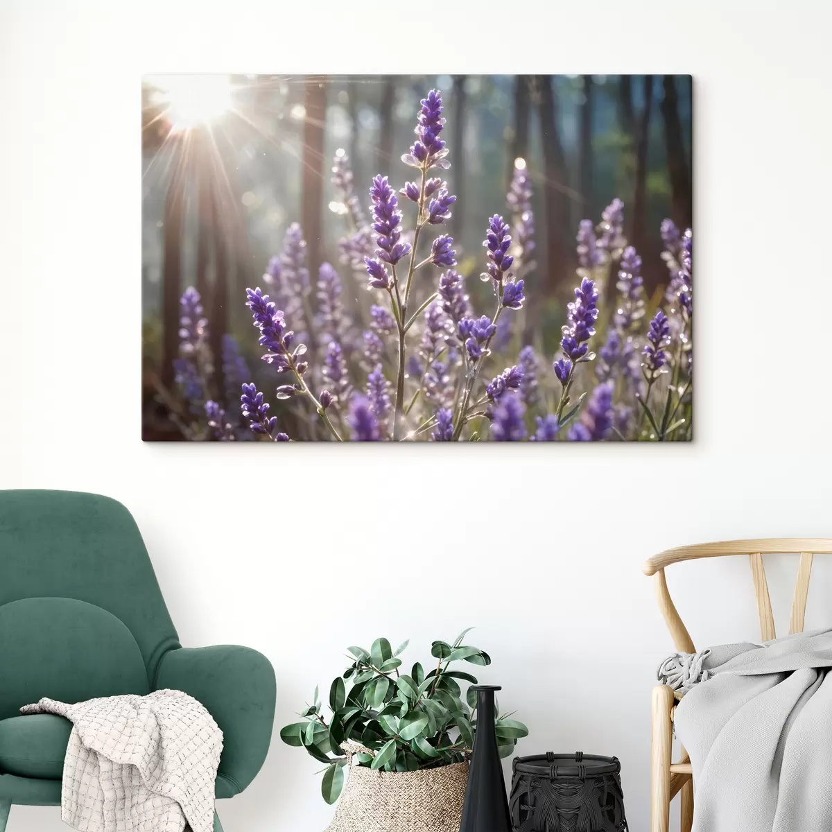 Quadri Fiori di lavanda viola in un campo, con uno sfondo sfocato della foresta e la luce del sole che filtra attraverso Nr s40570