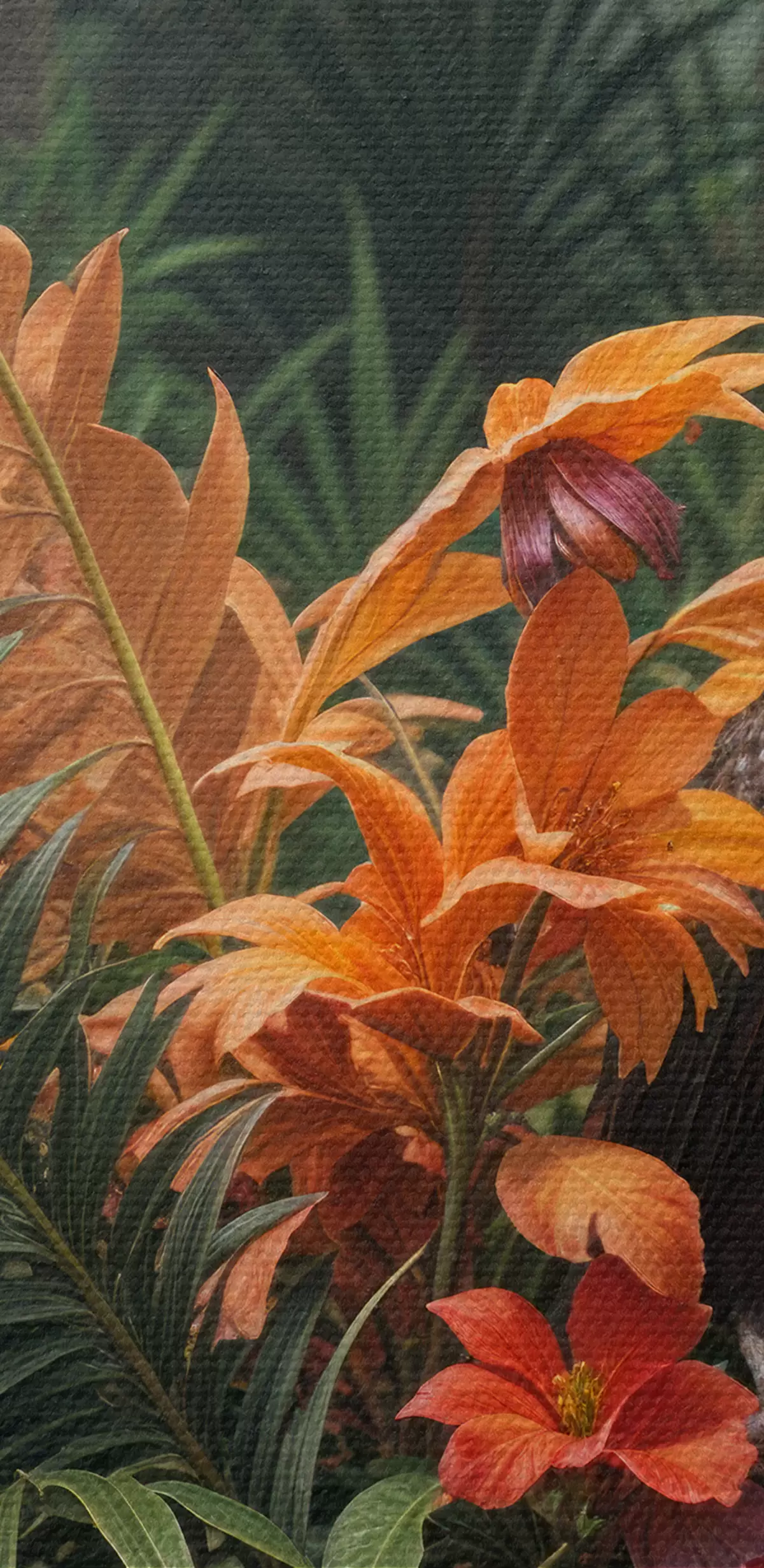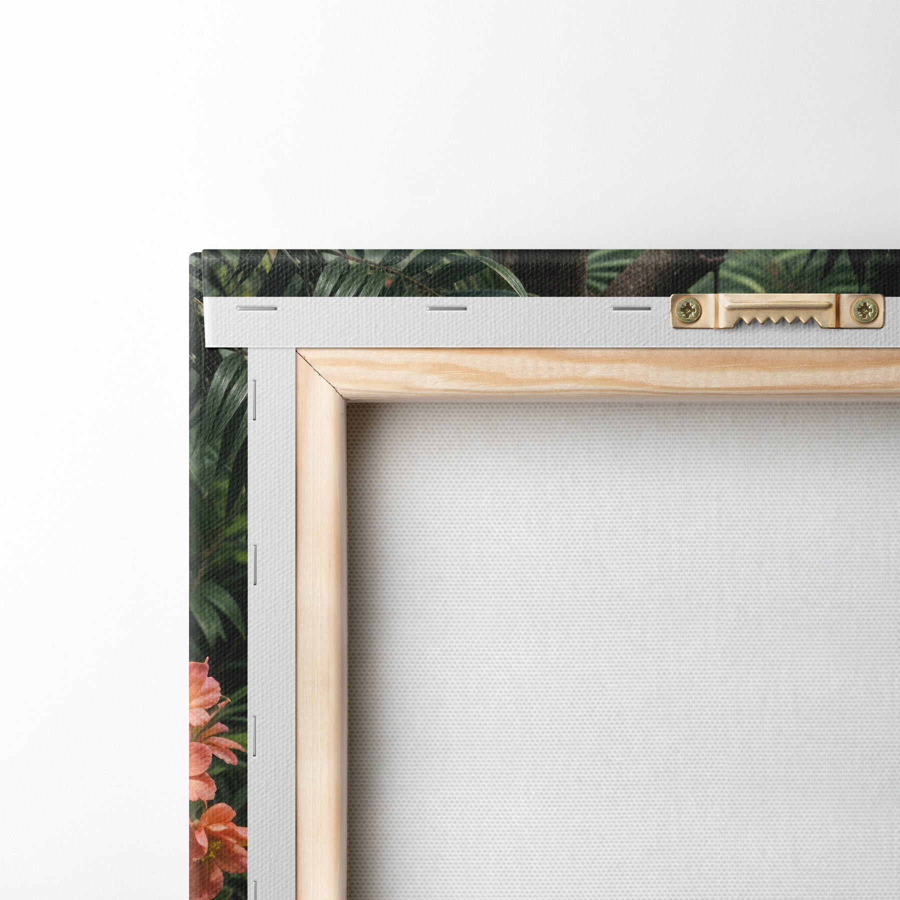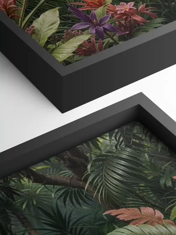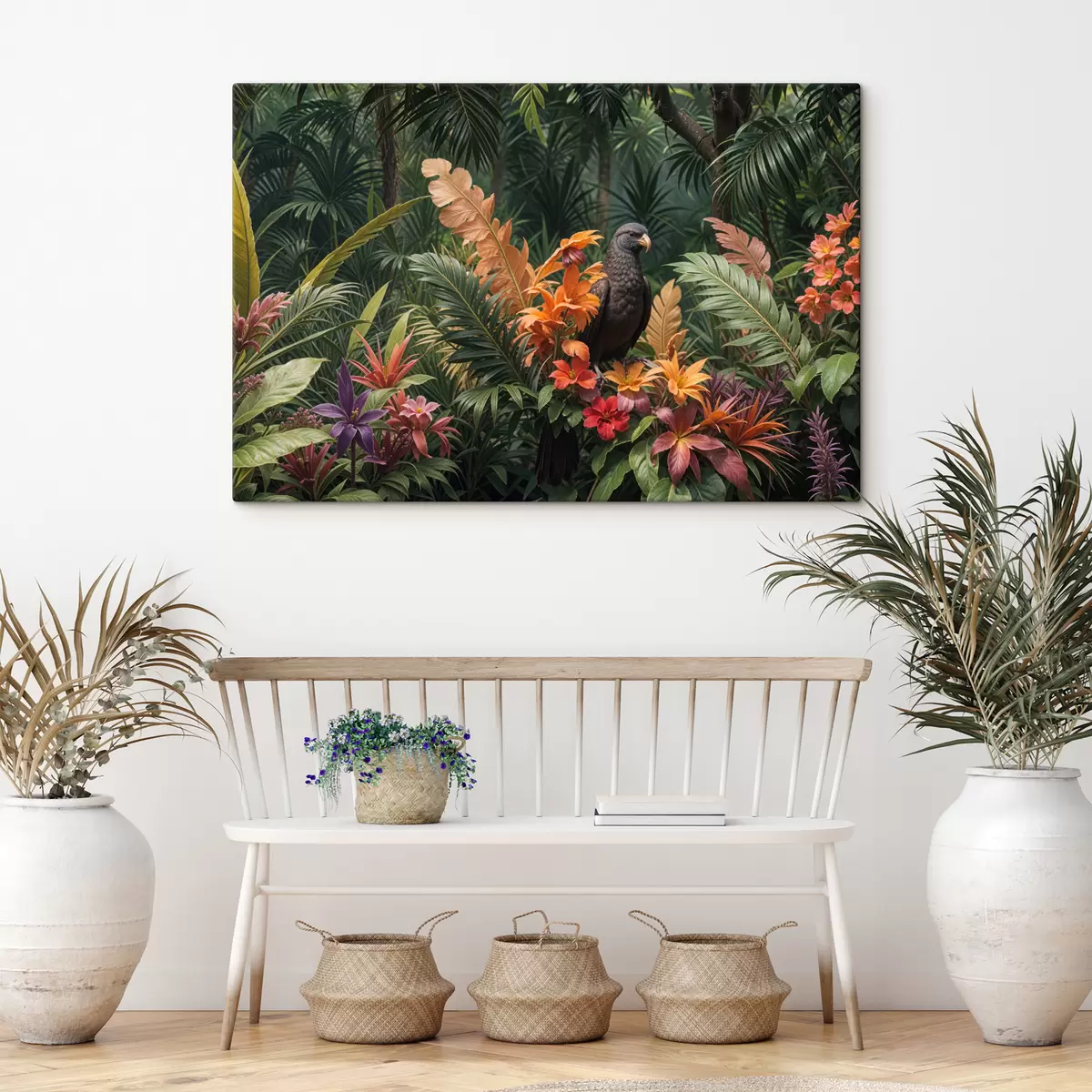 Quadri Uccello tropicale appollaiato su un ramo circondato da fogliame vibrante, foglie di palma, fiori e piante esotiche Nr s40578