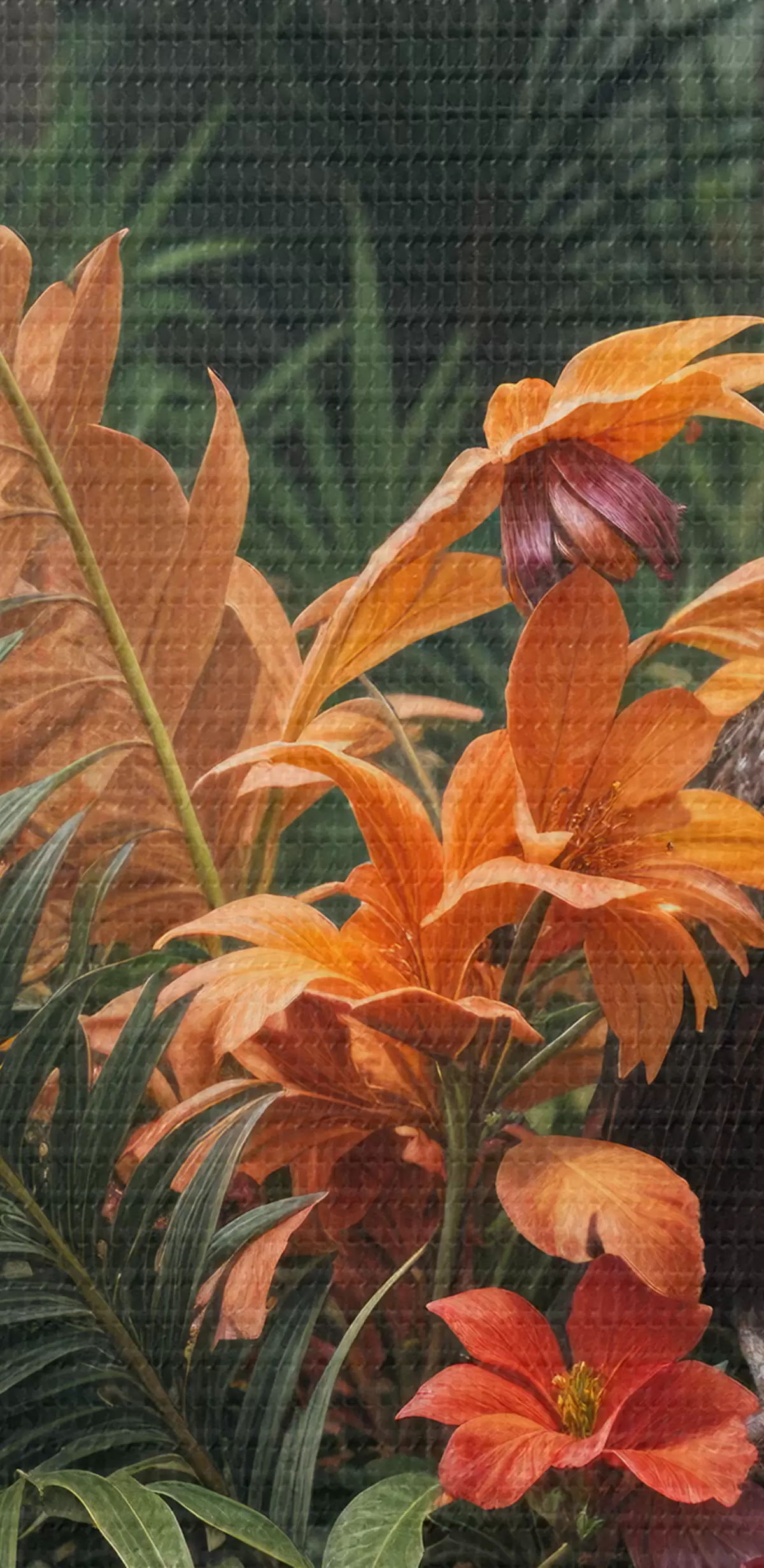 carta da parati Uccello tropicale appollaiato su un ramo circondato da fogliame vibrante, foglie di palma, fiori e piante esotiche nr. s40578