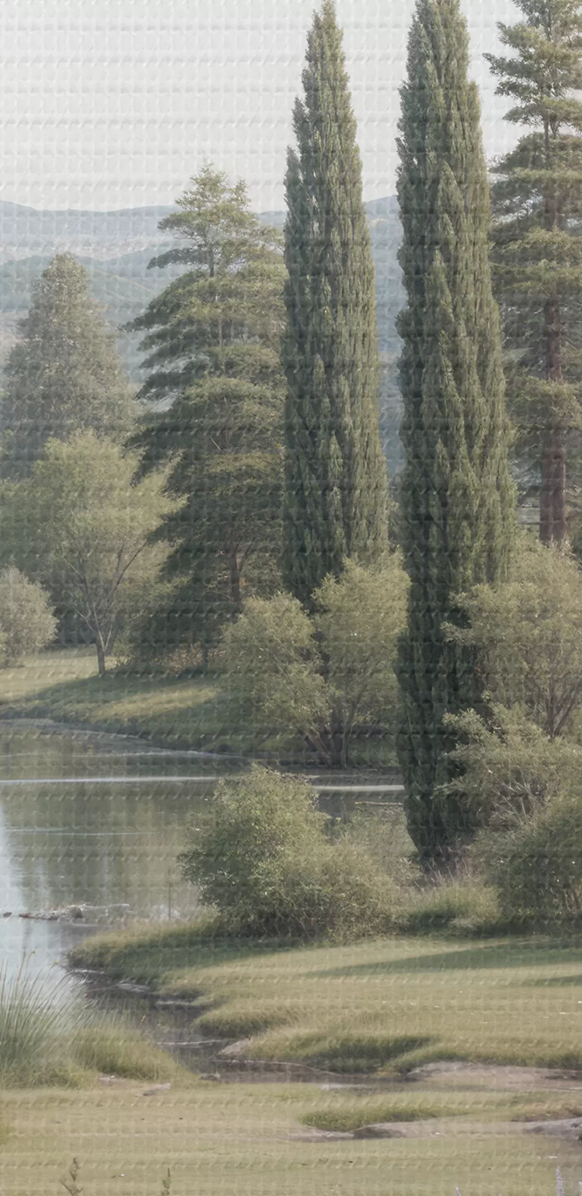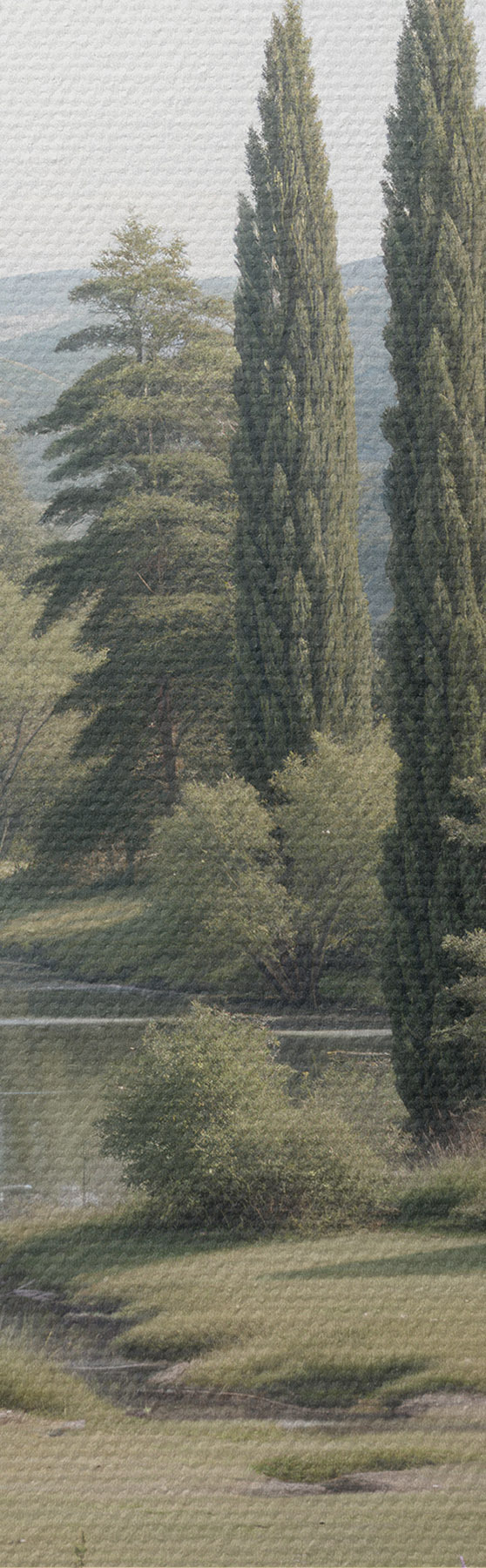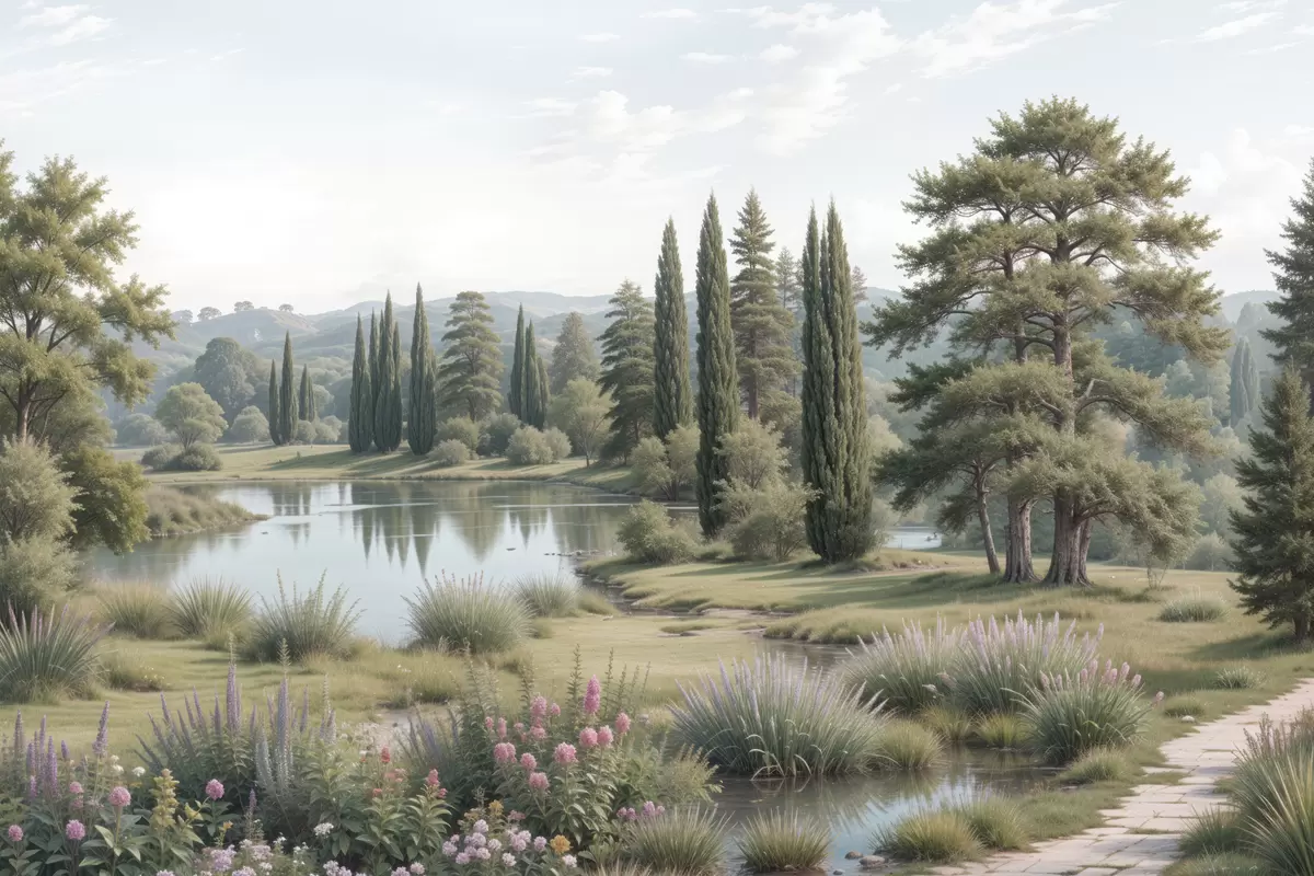 carta da parati Un paesaggio sereno con un lago tranquillo circondato da pini, cipressi e altra vegetazione rigogliosa nr. s40579