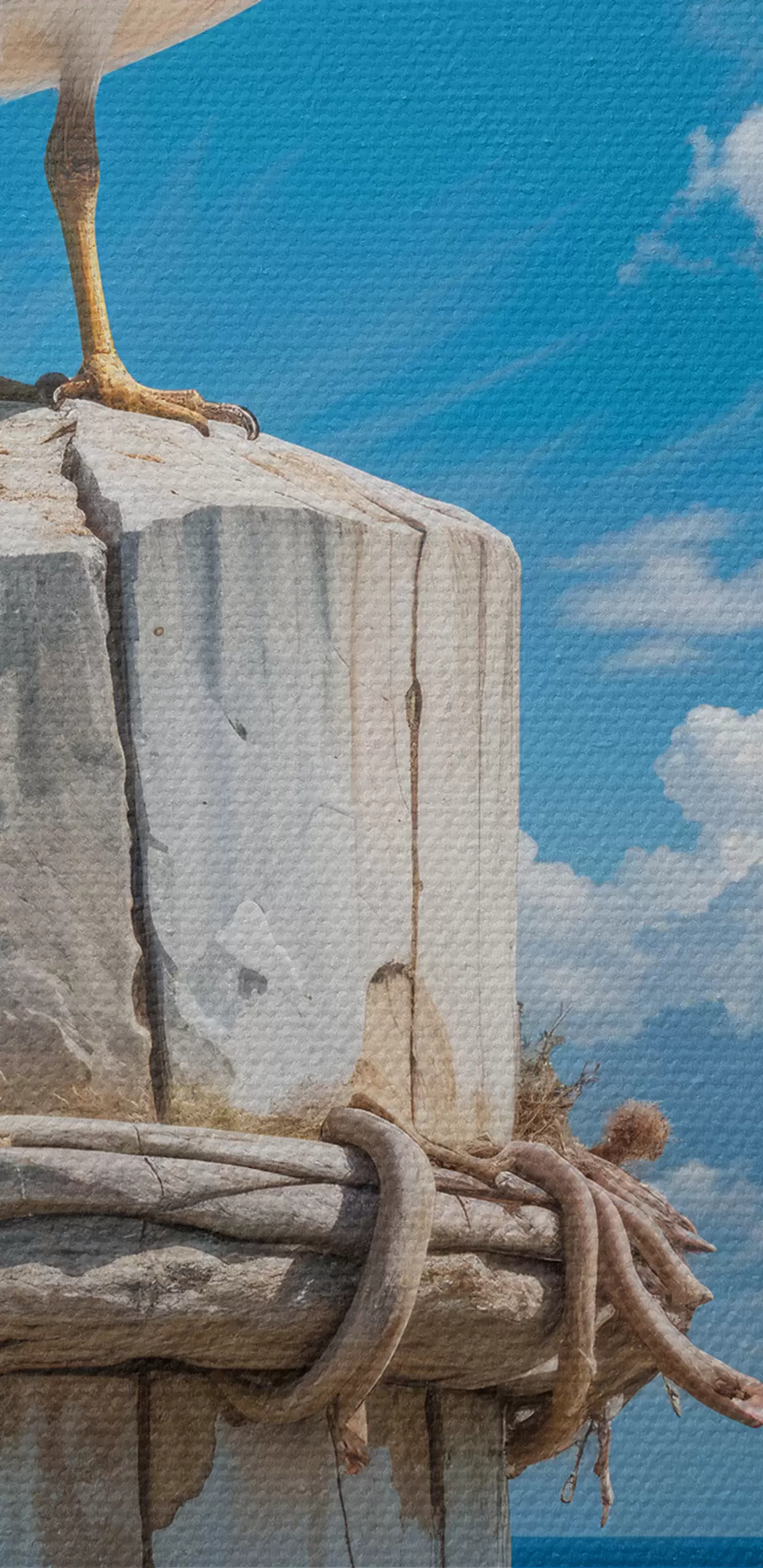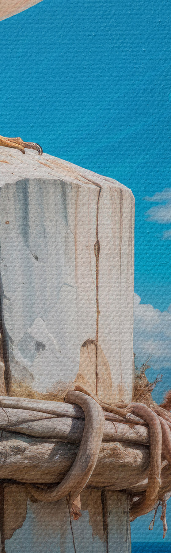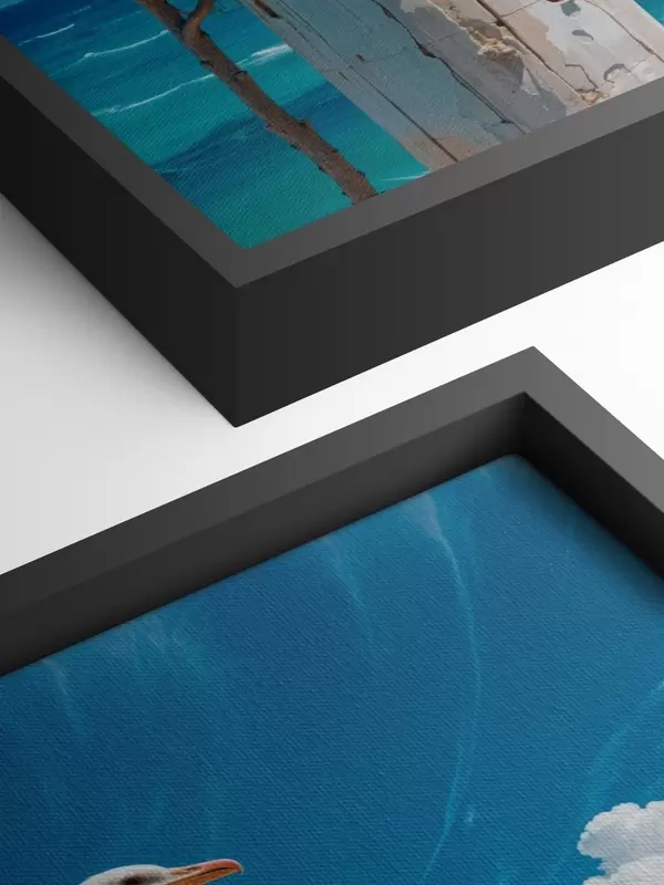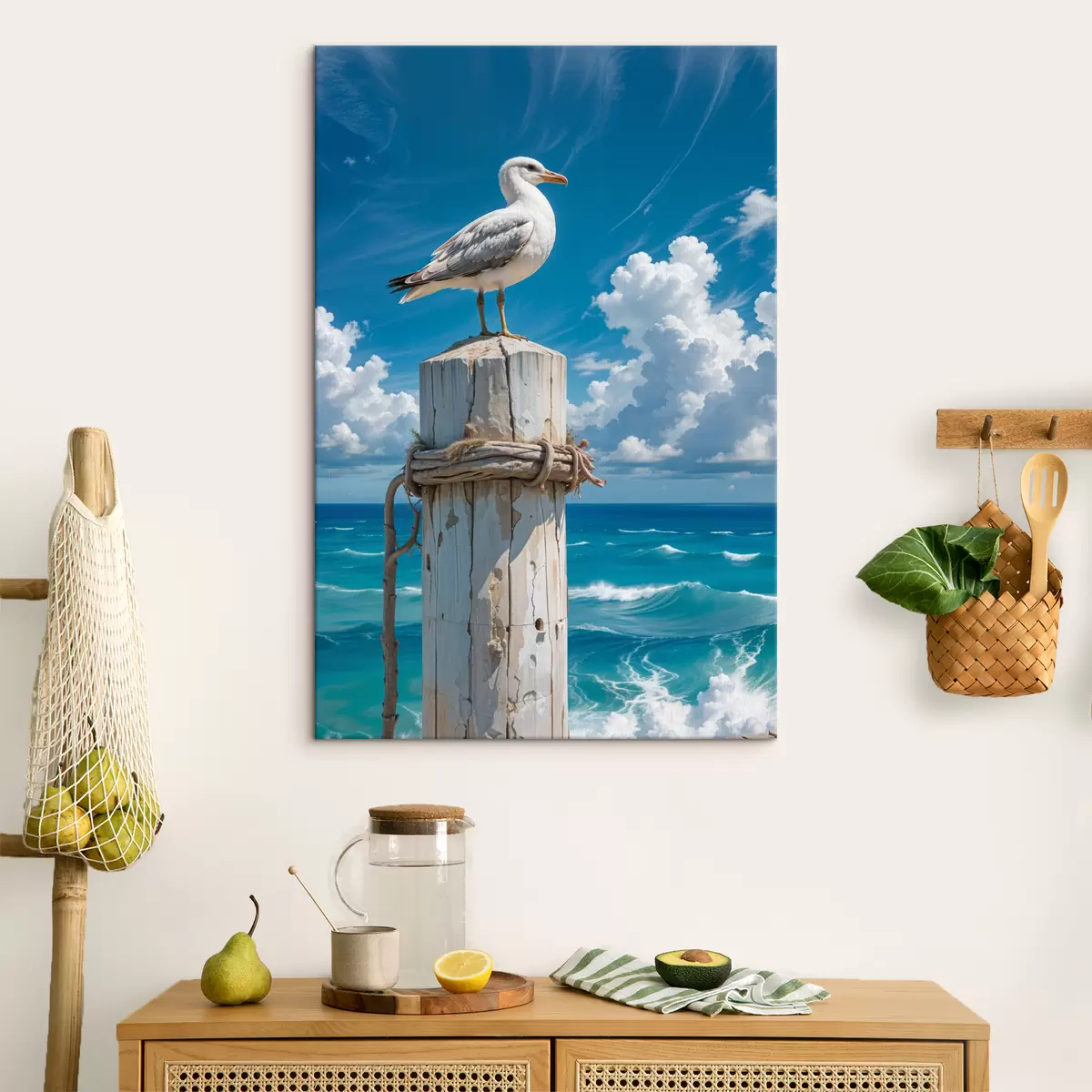 Quadri Un gabbiano bianco appollaiato su un palo di legno contro un cielo blu brillante e l'oceano con le onde Nr s40590