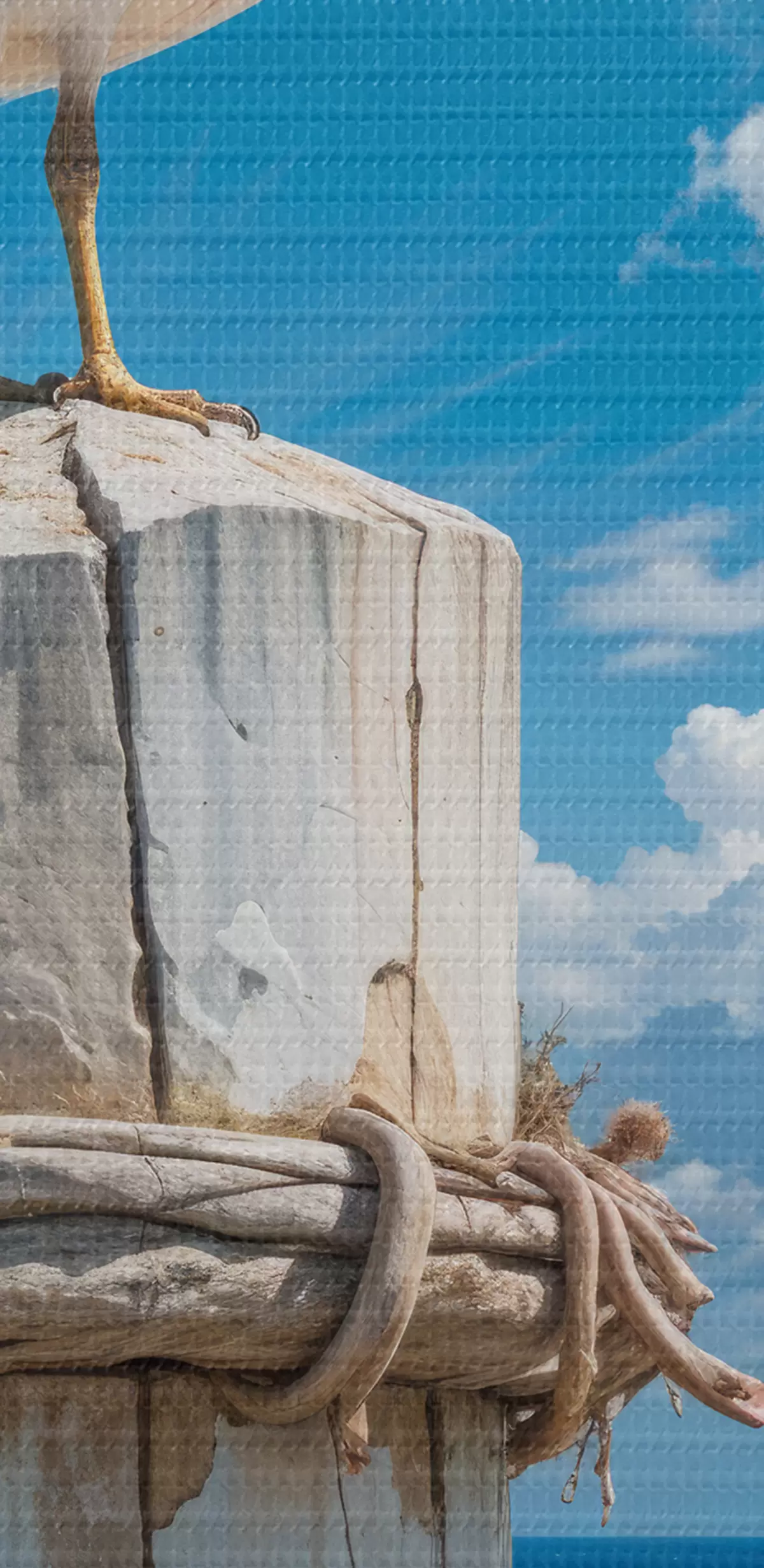 carta da parati Un gabbiano bianco appollaiato su un palo di legno contro un cielo blu brillante e l'oceano con le onde  nr. s40590