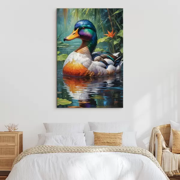 Quadri Un'anatra mandarina maschio colorata che nuota in uno stagno con fogliame verde e foglie autunnali cadute Nr s40594