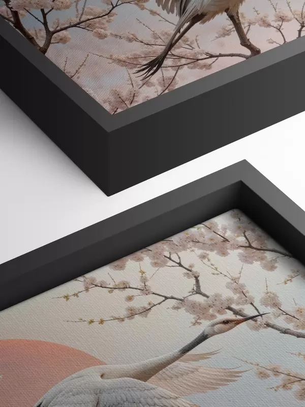 Quadri Due gru bianche che volano tra gli alberi di ciliegio in fiore in un cielo rosa al tramonto Nr s40601