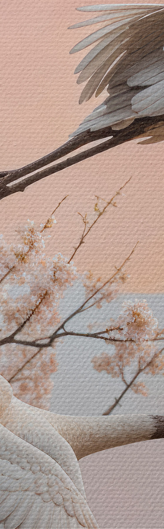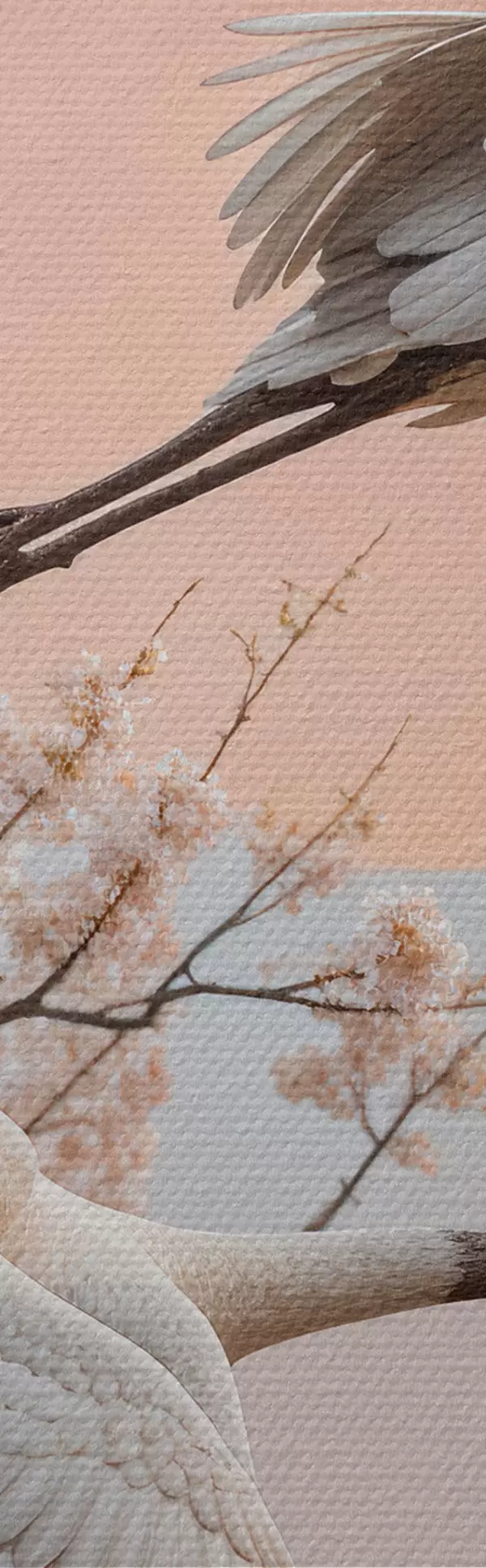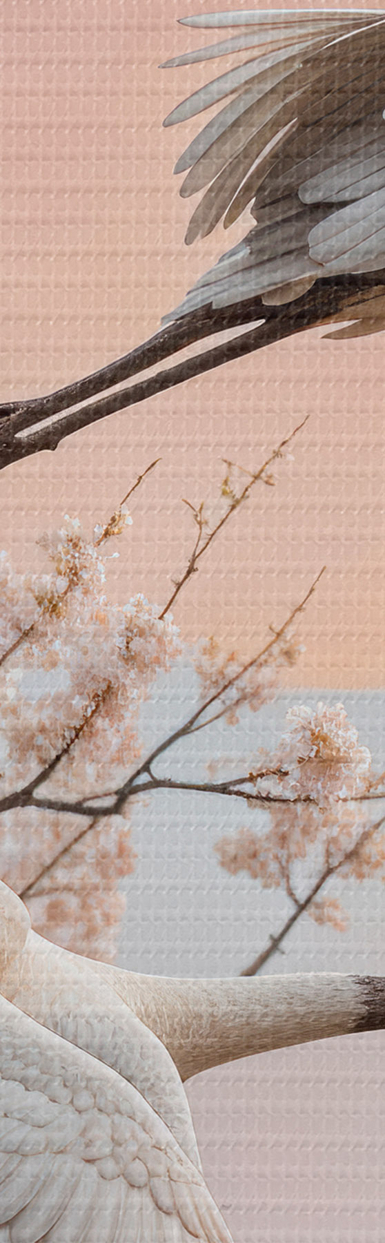 carta da parati Due gru bianche che volano tra gli alberi di ciliegio in fiore in un cielo rosa al tramonto nr. s40601