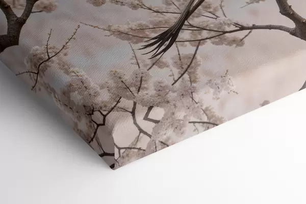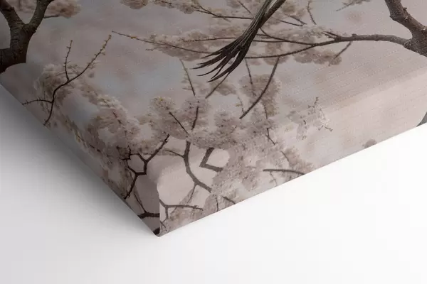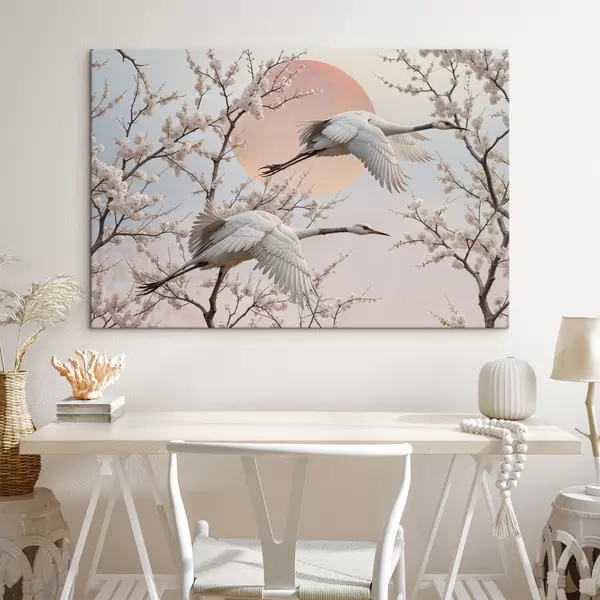 Quadri Due gru bianche che volano tra gli alberi di ciliegio in fiore in un cielo rosa al tramonto Nr s40601