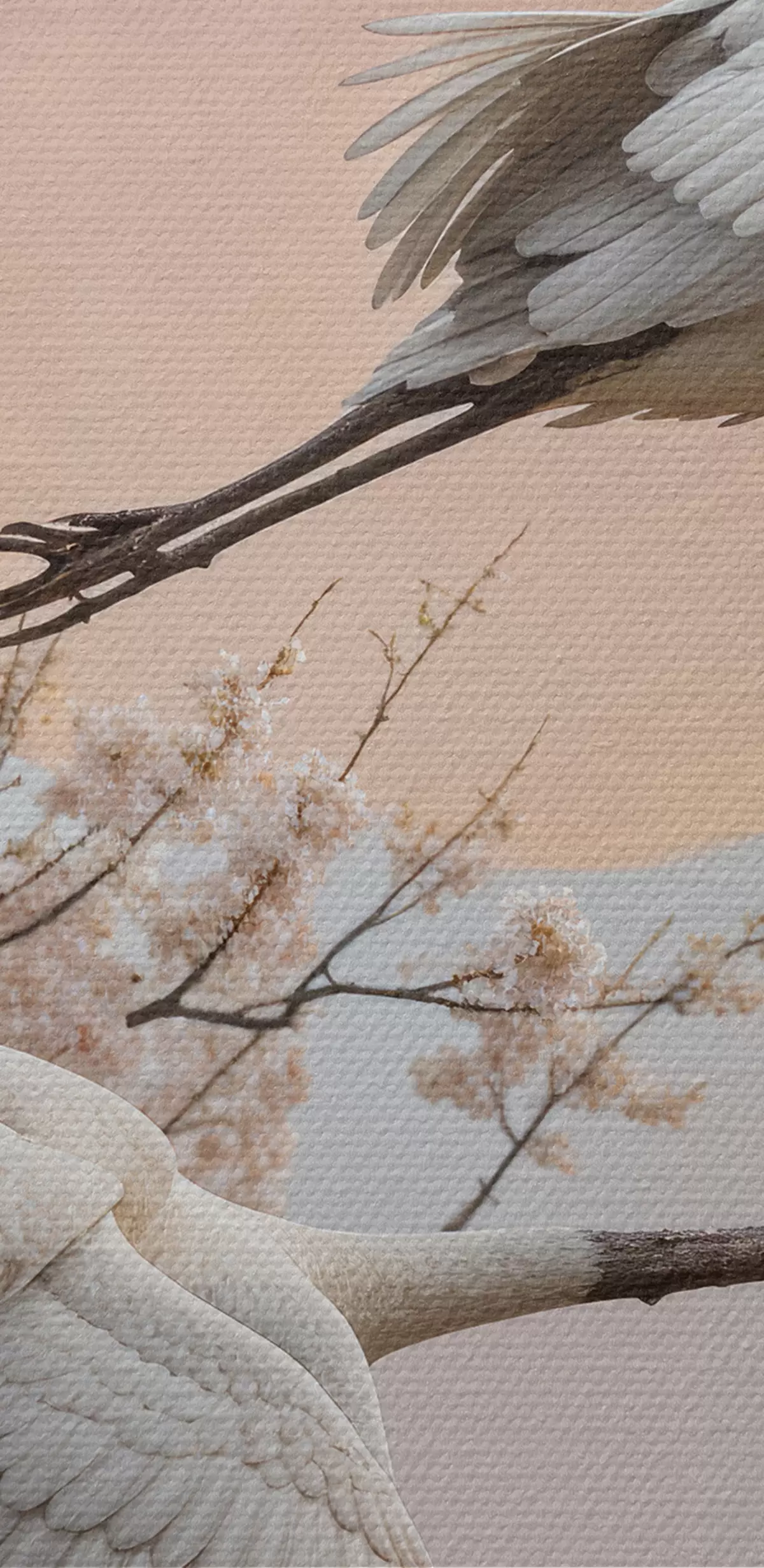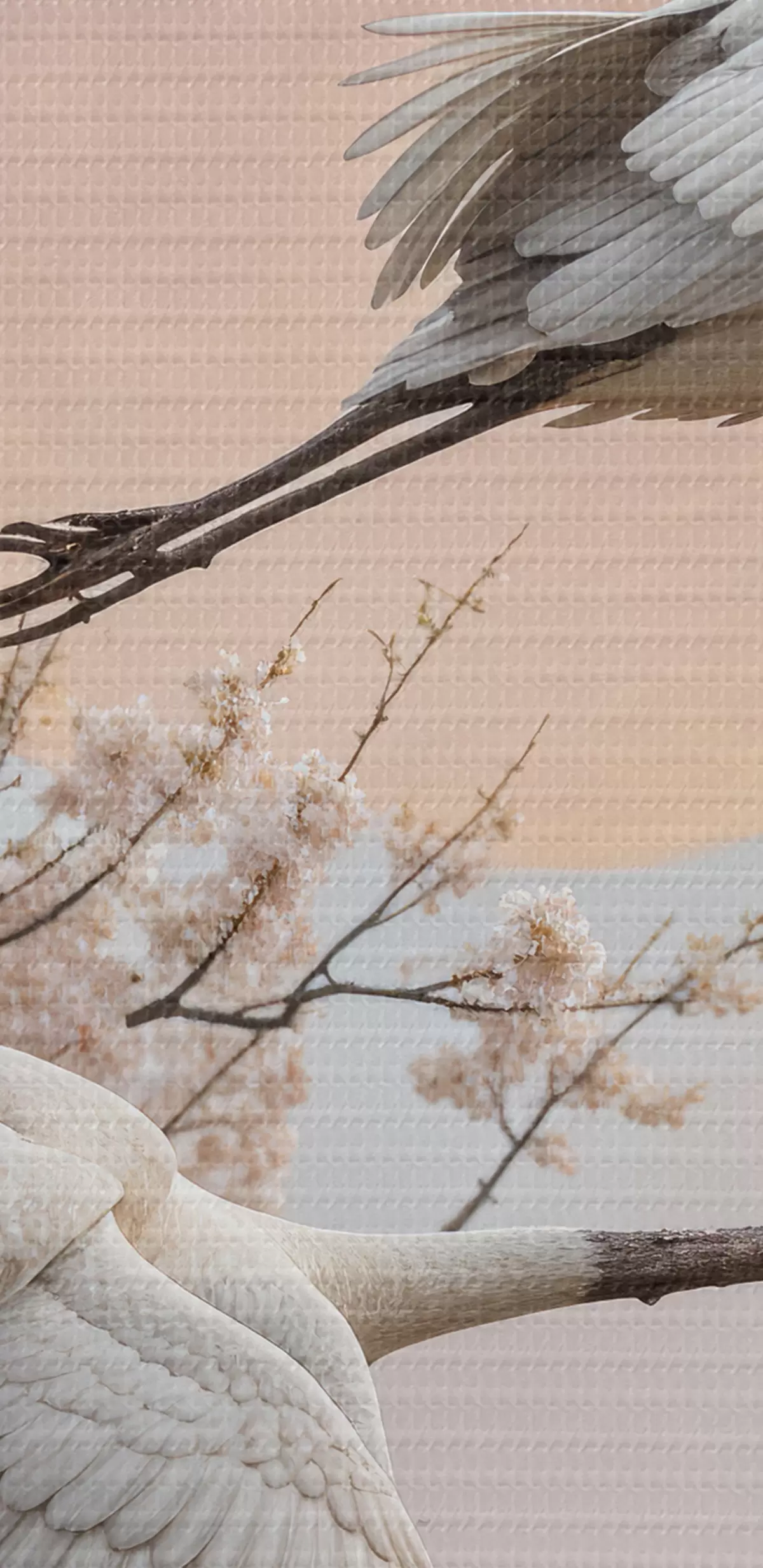 carta da parati Due gru bianche che volano tra gli alberi di ciliegio in fiore in un cielo rosa al tramonto nr. s40601