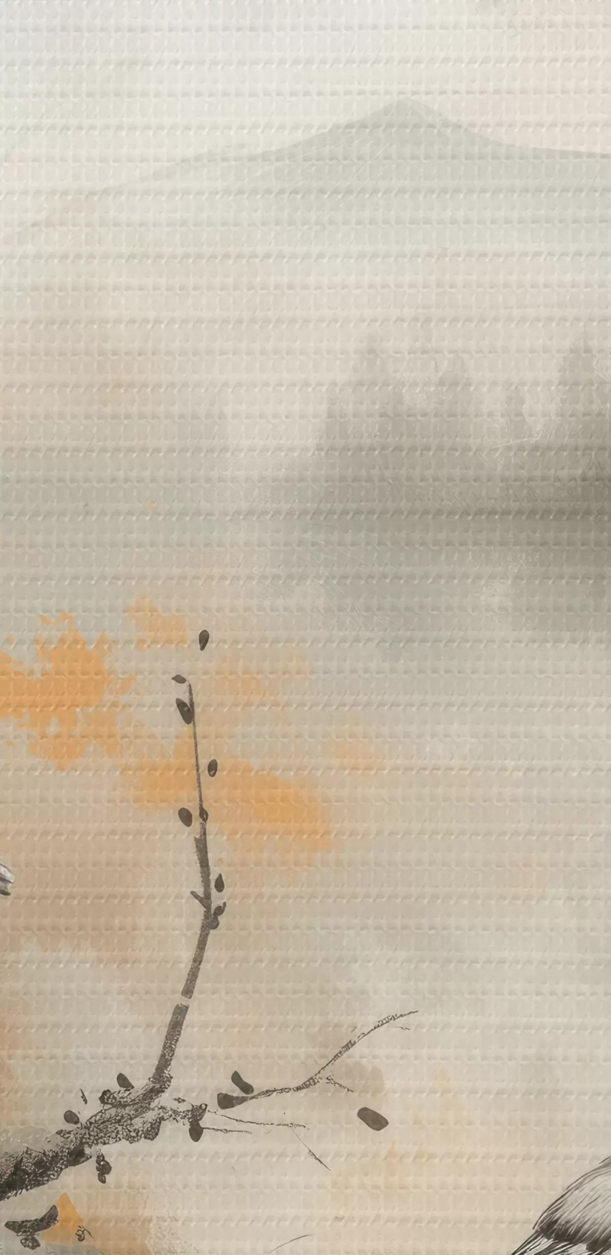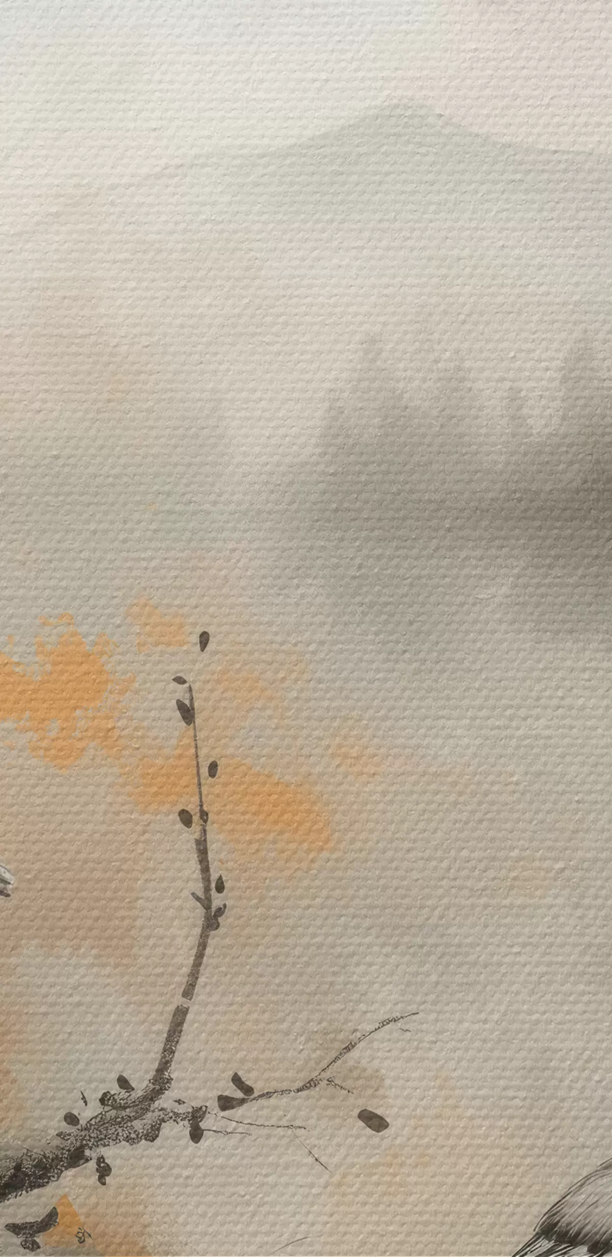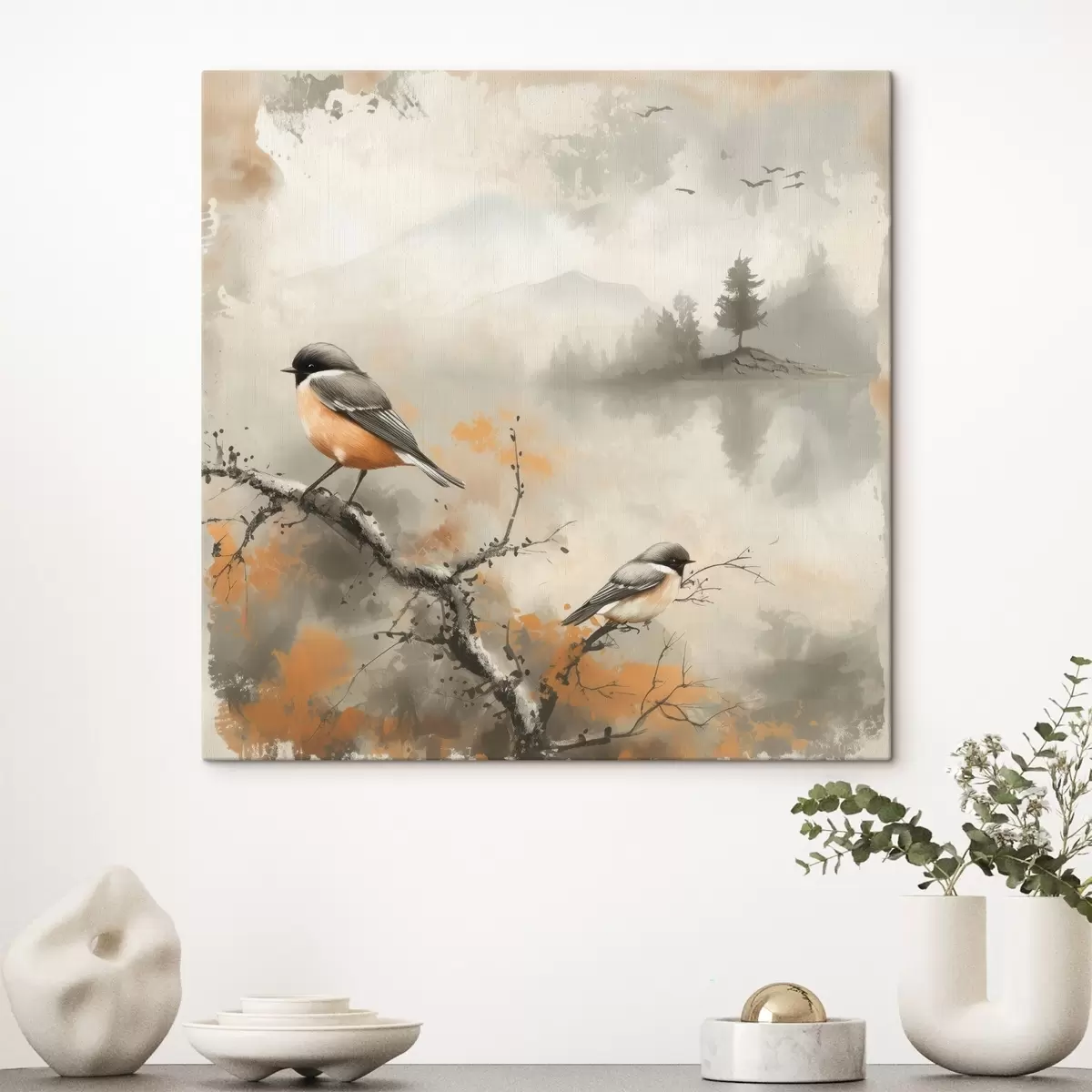 Quadri Paesaggio acquerellato con uccelli seduti su un ramo in colori pastello Nr s40655