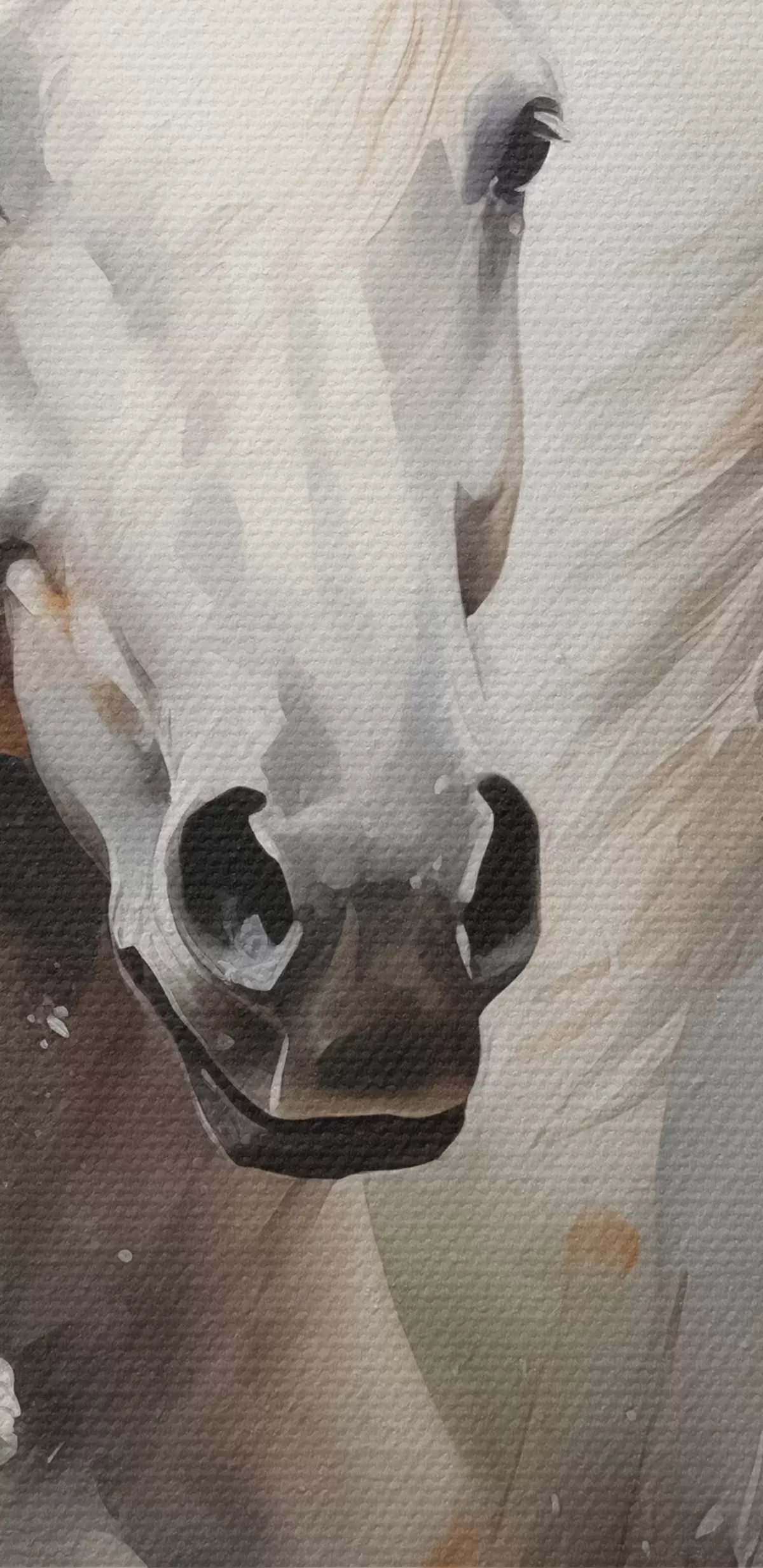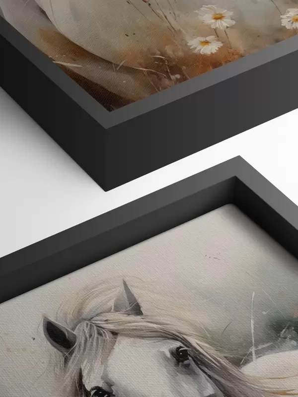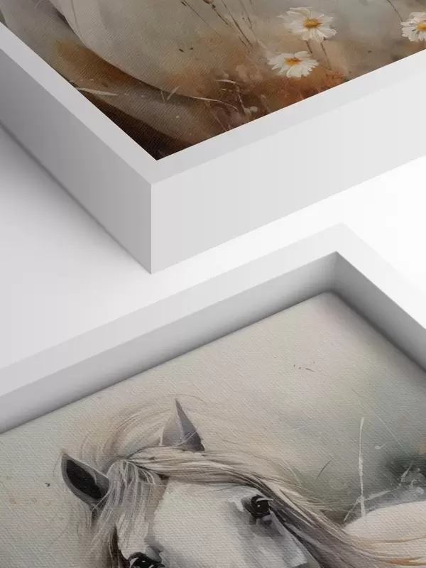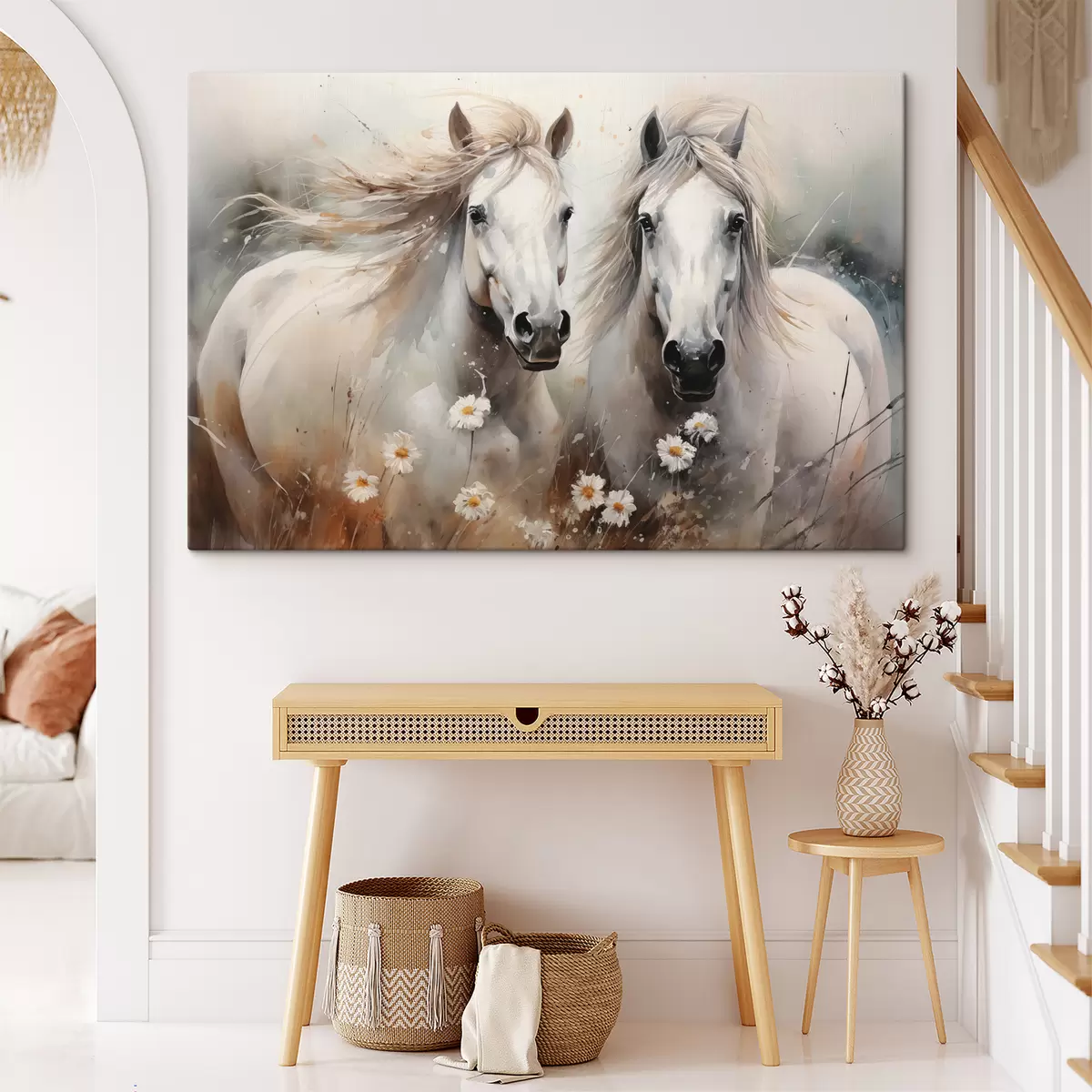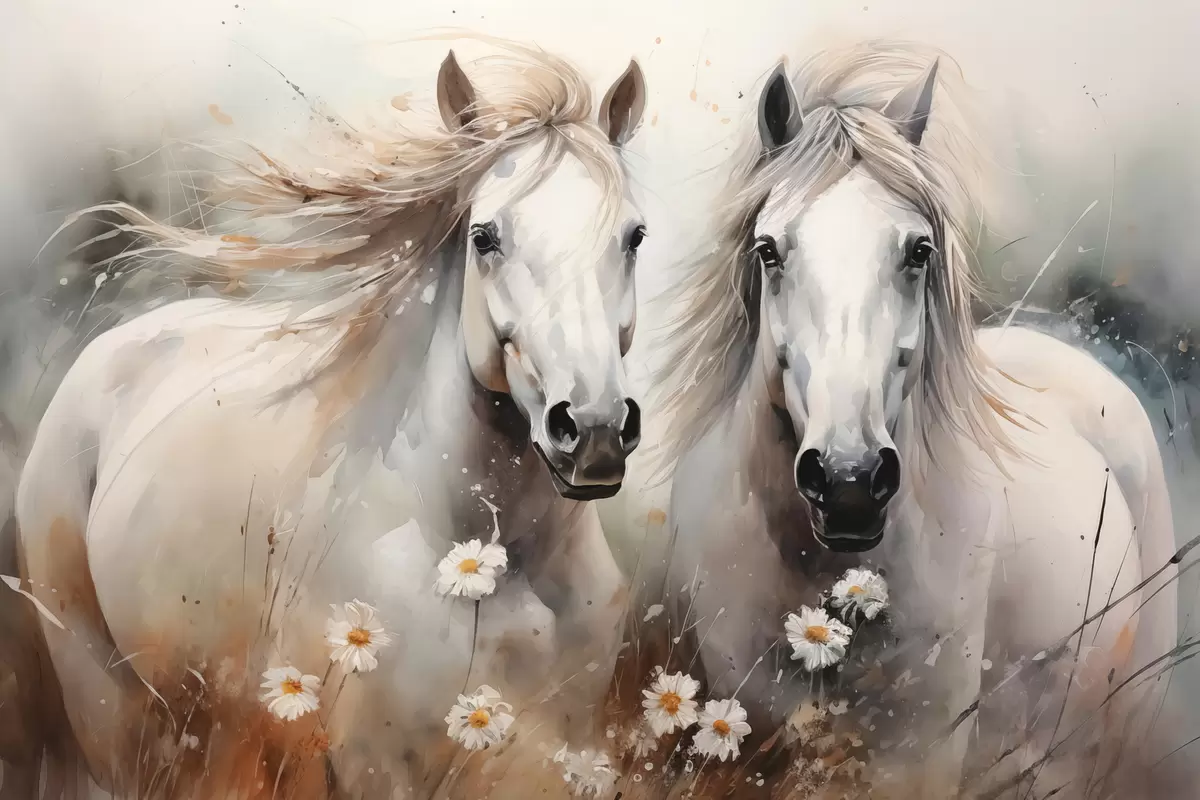 Quadri Una coppia di cavalli bianchi e grigi vicino a delle margherite Nr s40749
