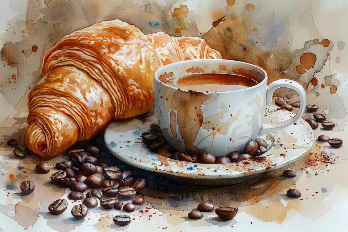 Quadri Croissant, mattina, croissant e tazza di caffè, acquerello Nr s40782
