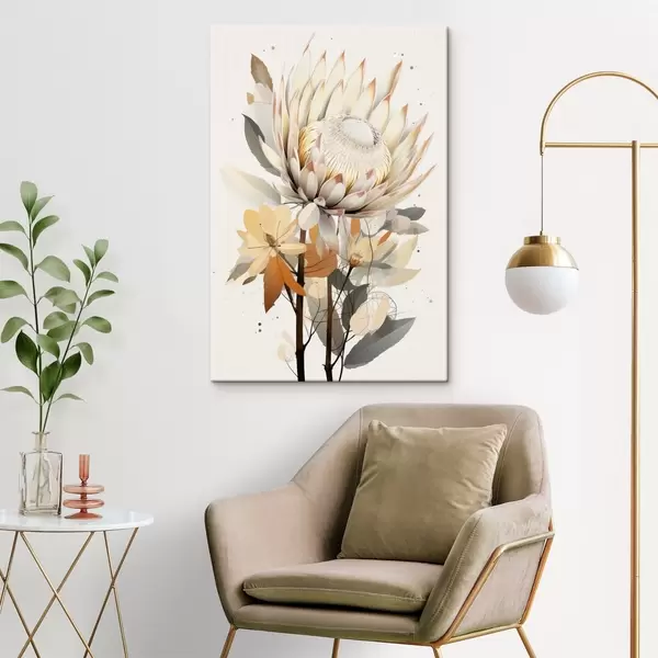 Quadri Bellissimi fiori di protea con foglie rigogliose, colori beige tenui, cotone Nr s40817