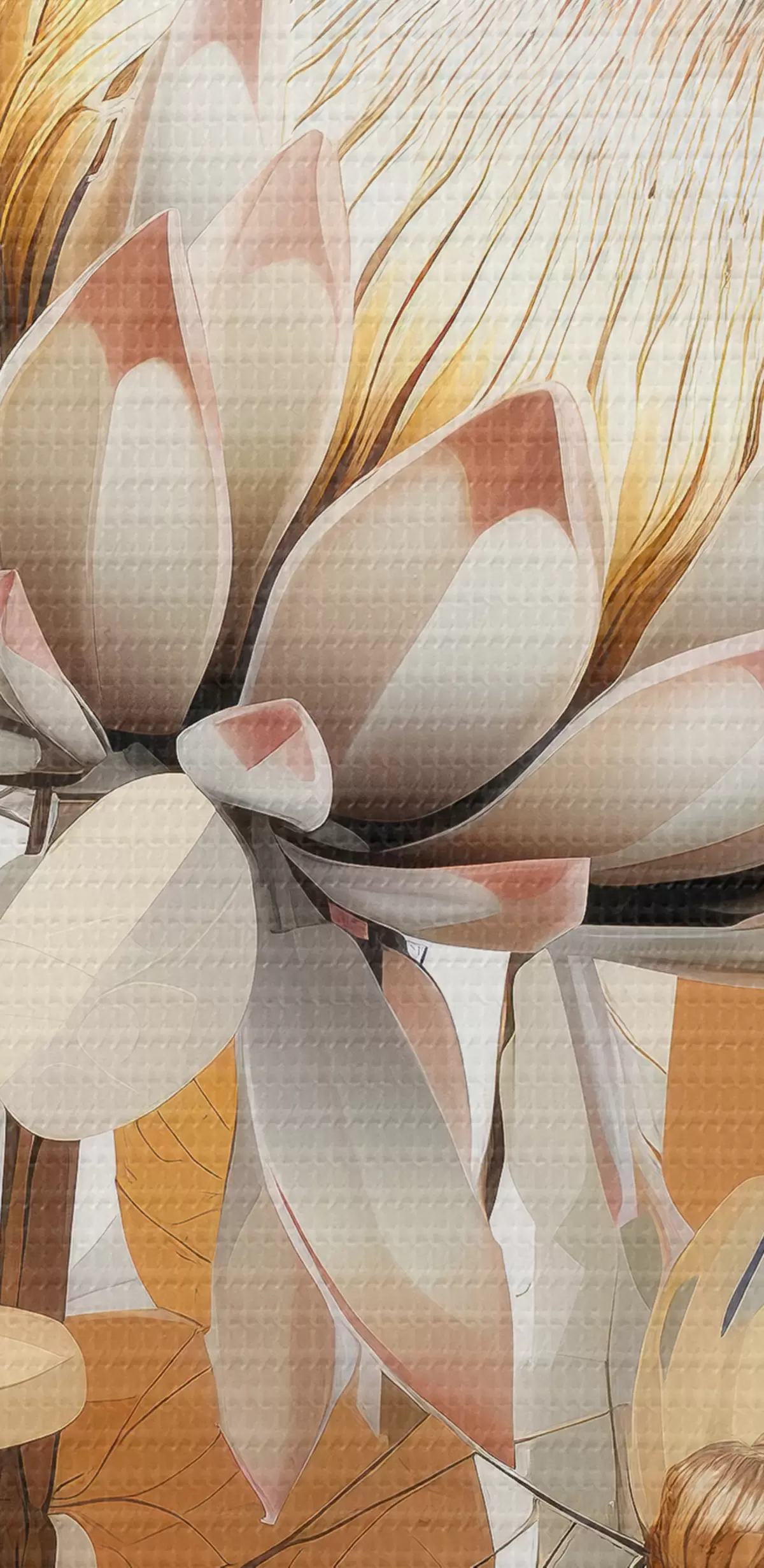 carta da parati Bellissimi fiori di protea con foglie rigogliose, colori beige tenui, cotone nr. s40817