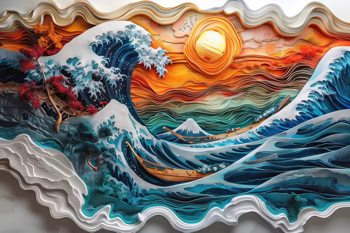 carta da parati Imitazione di bassorilievo: un oceano impetuoso con barche e sole nr. s40976