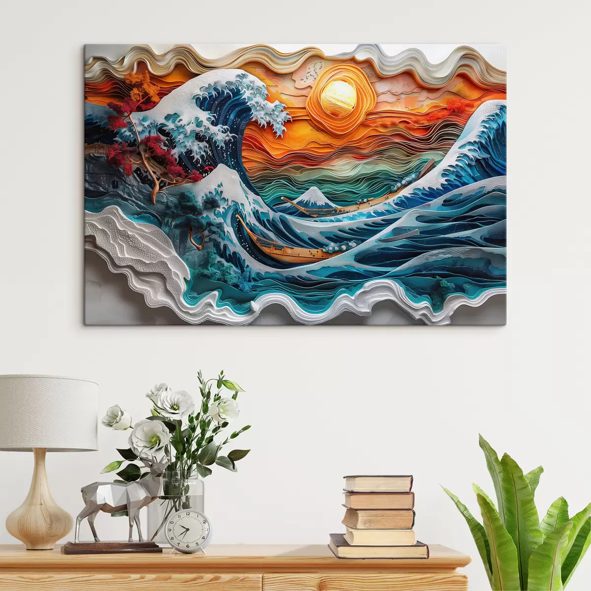 Quadri Imitazione di bassorilievo: un oceano impetuoso con barche e sole Nr s40976