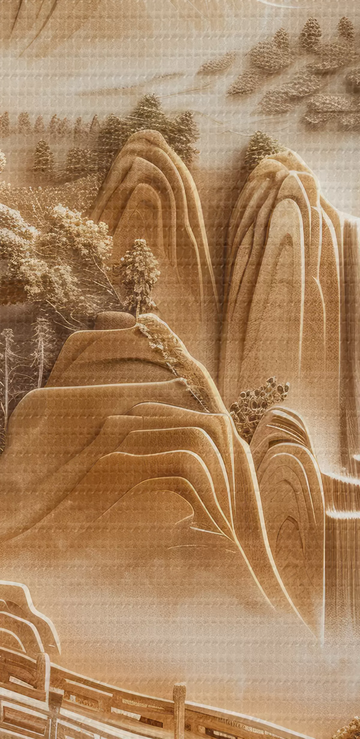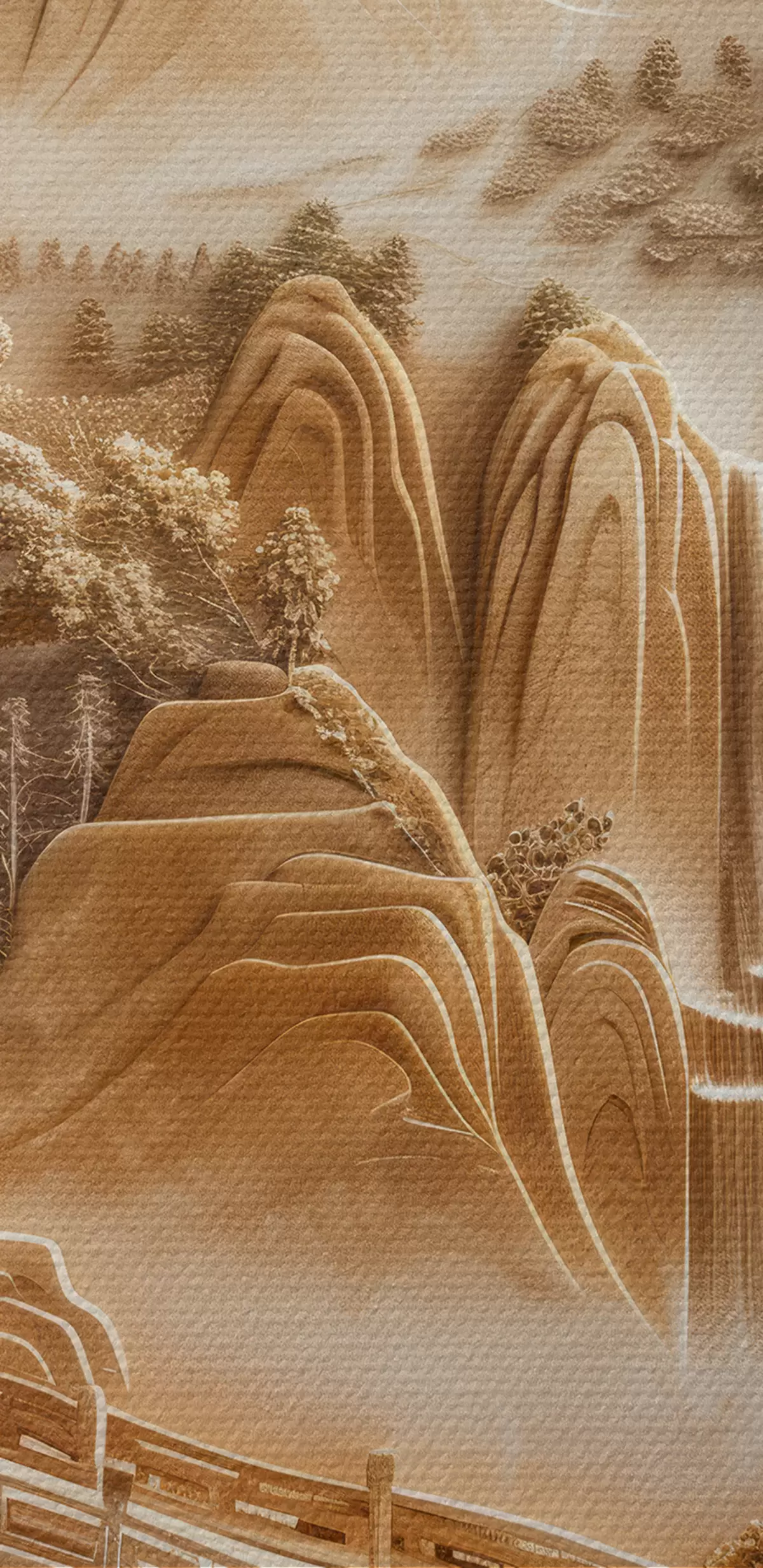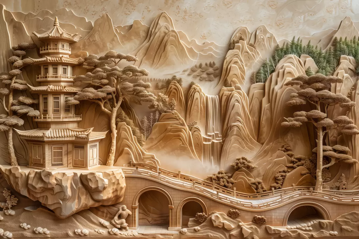 carta da parati Imitazione di bassorilievo: montagne con alberi, un ponte e un tempio, multistrato nr. s40989
