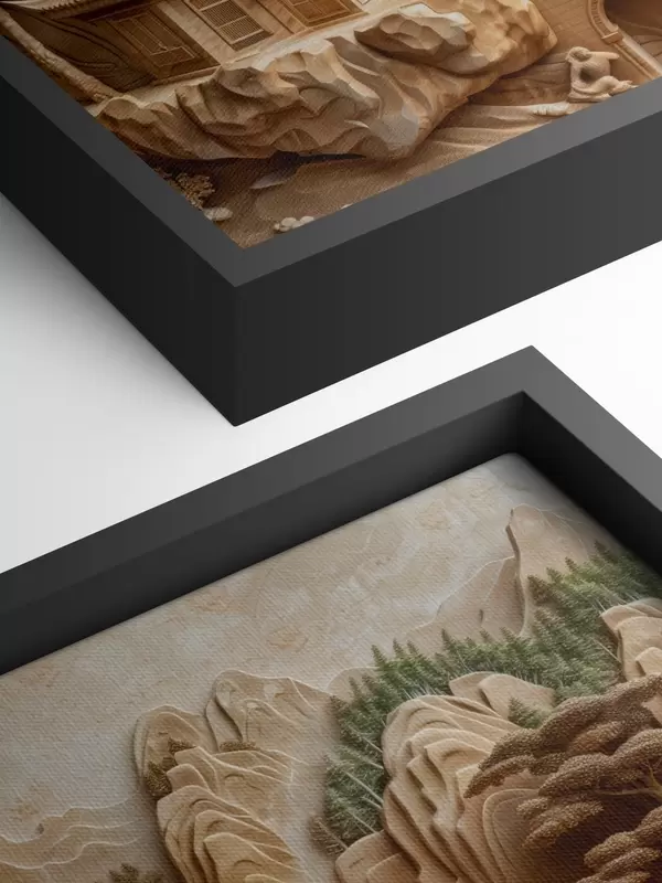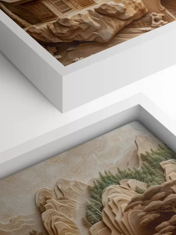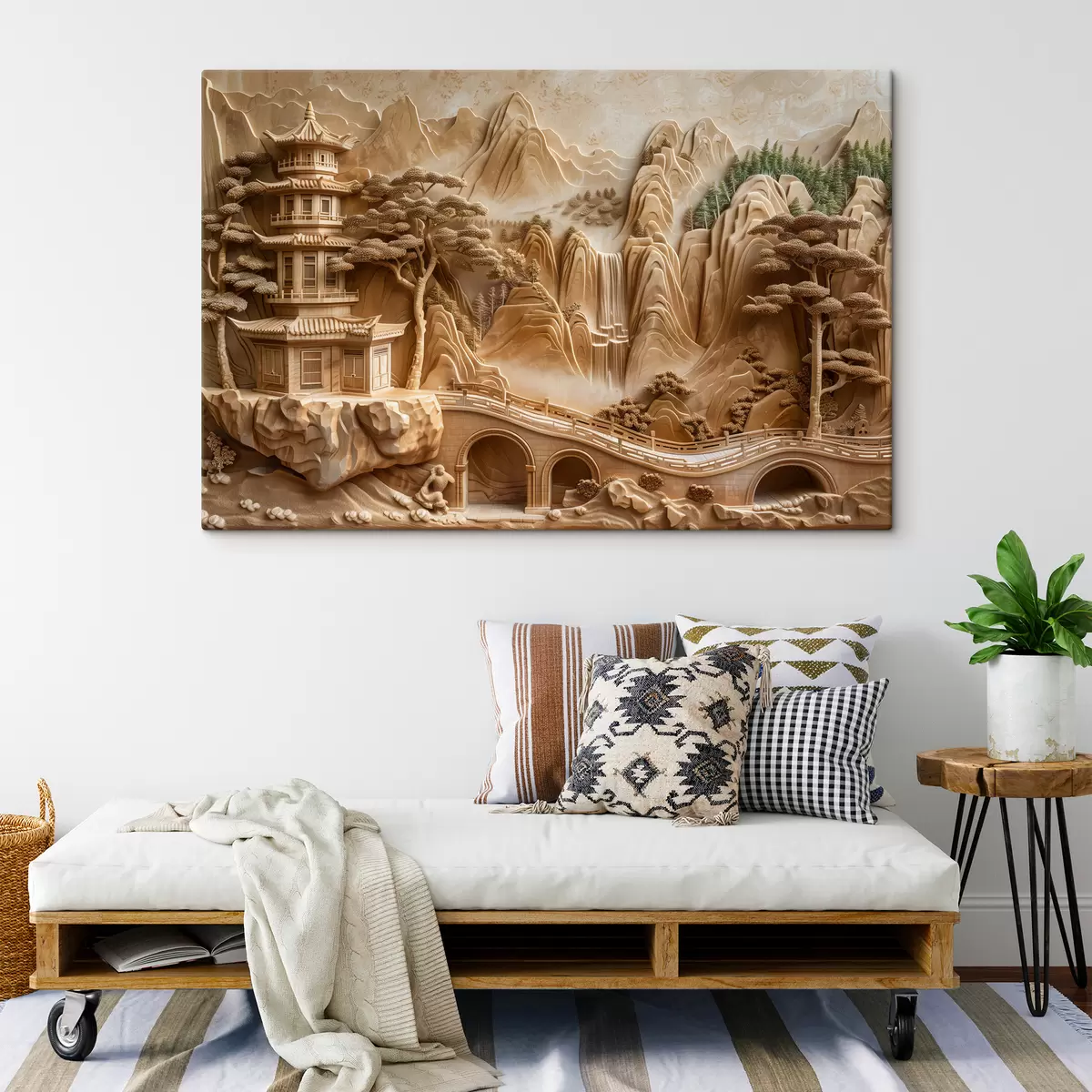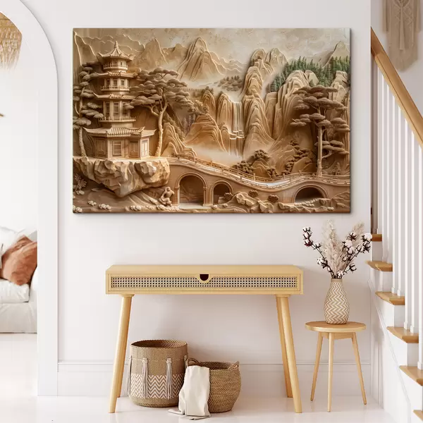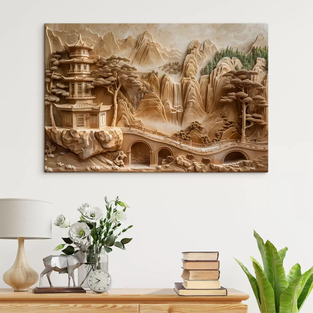 Quadri Imitazione di bassorilievo: montagne con alberi, un ponte e un tempio, multistrato Nr s40989