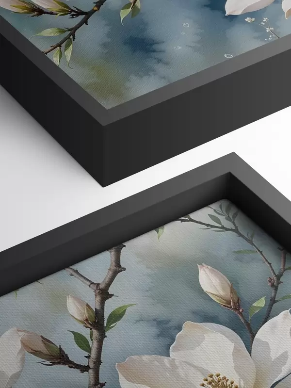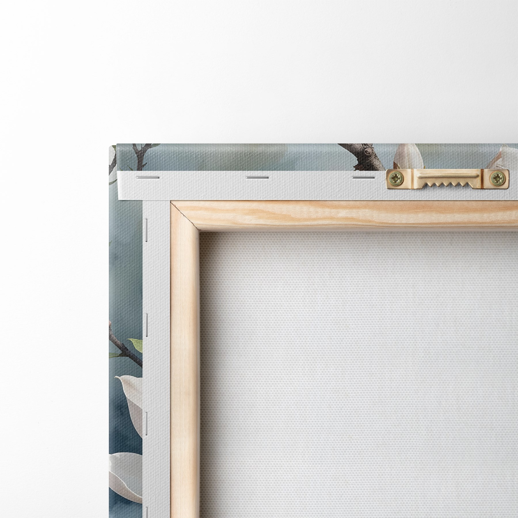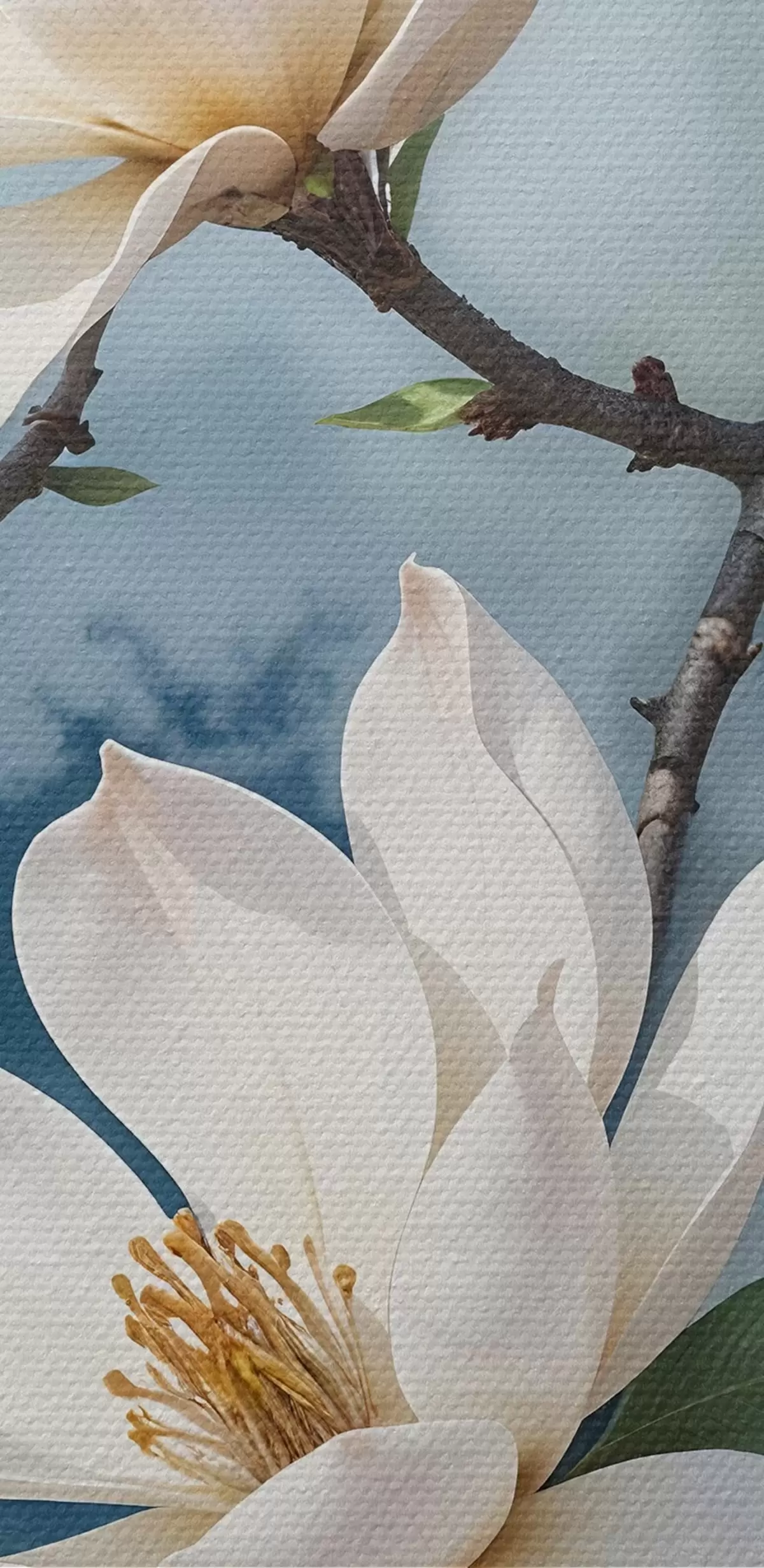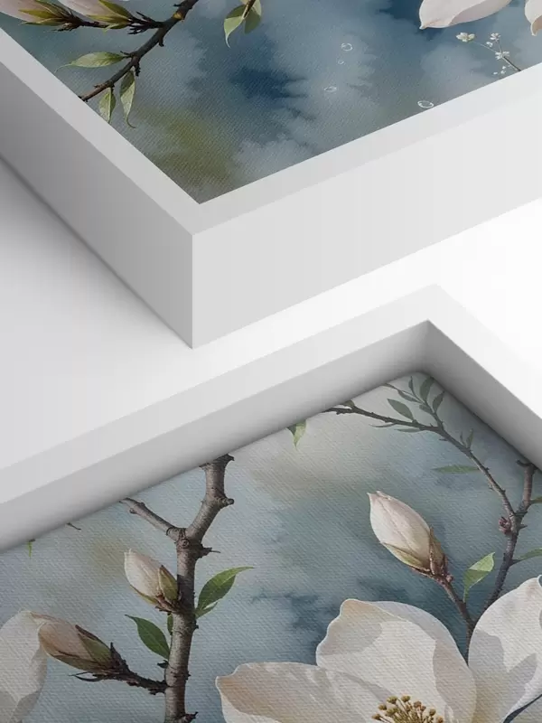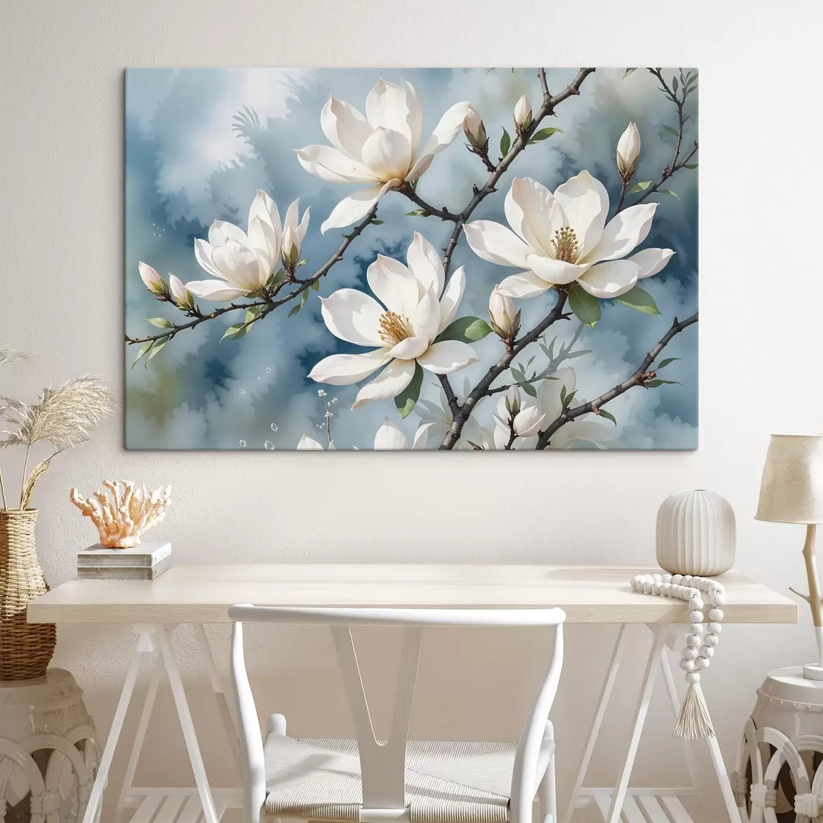 Quadri Fiori bianchi di magnolia che sbocciano sui rami degli alberi su uno sfondo di cielo blu acquerellato Nr s41081