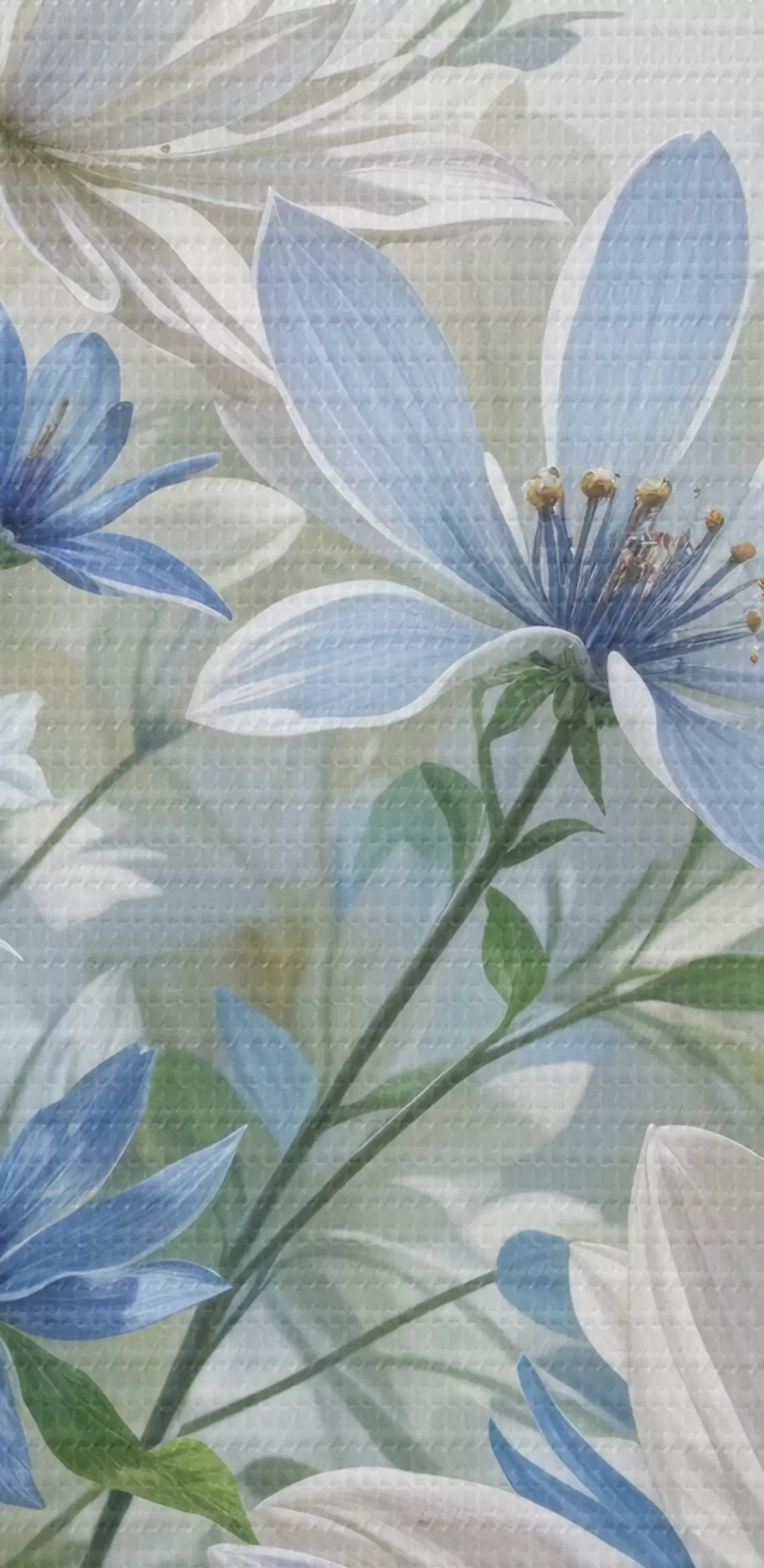 carta da parati Un campo di fiori bianchi e blu simili a margherite con foglie e steli verdi su uno sfondo morbido e sfocato nr. s41086
