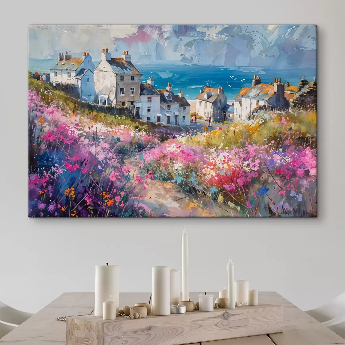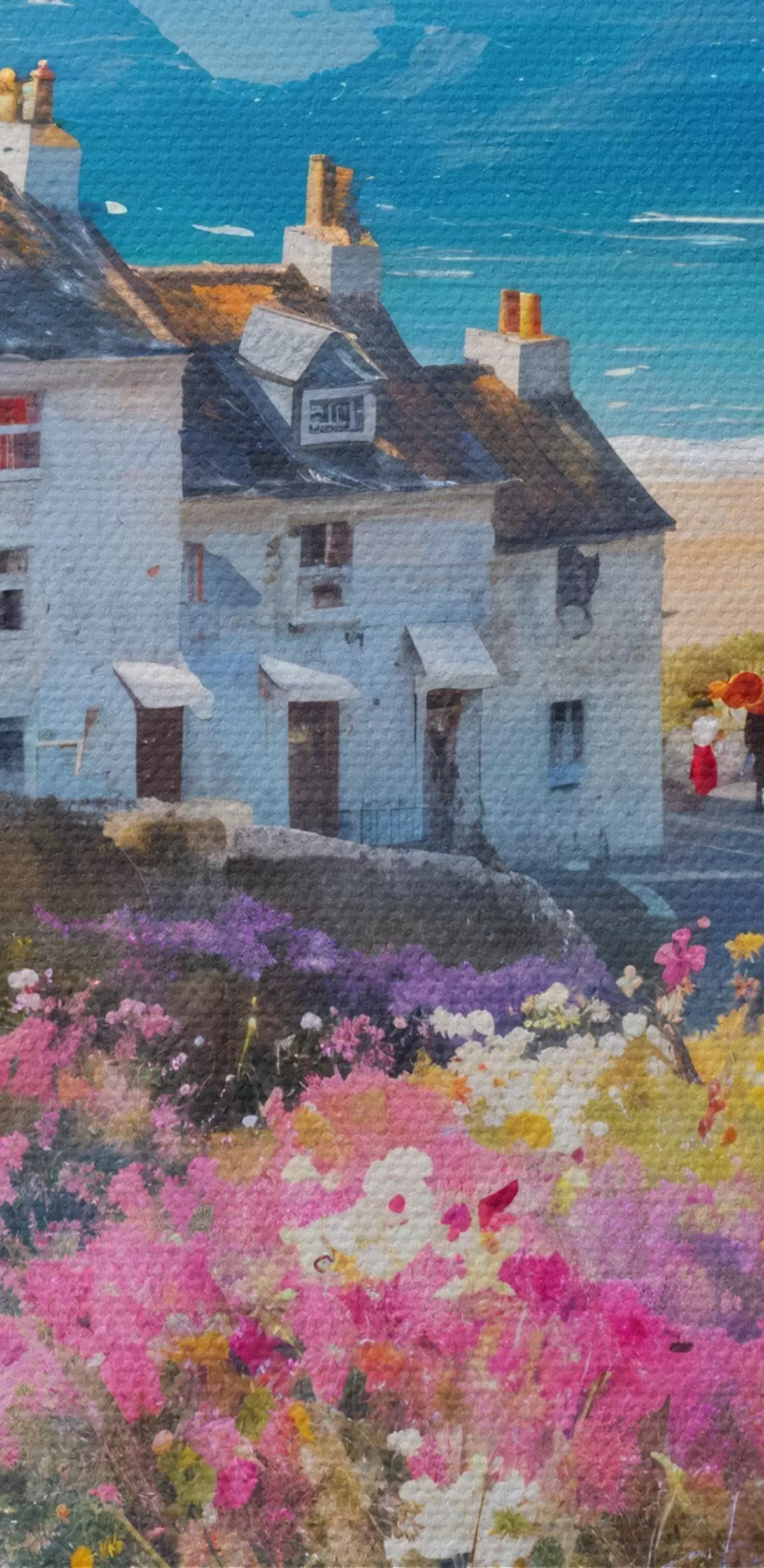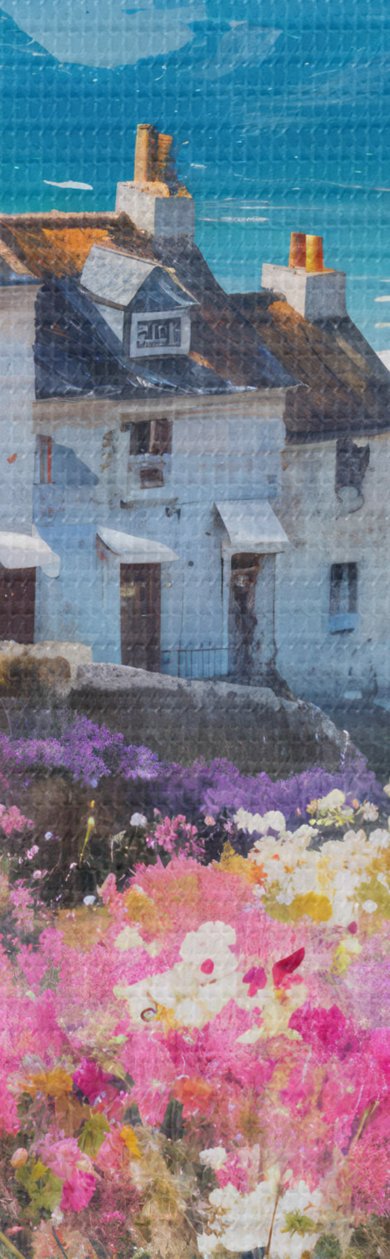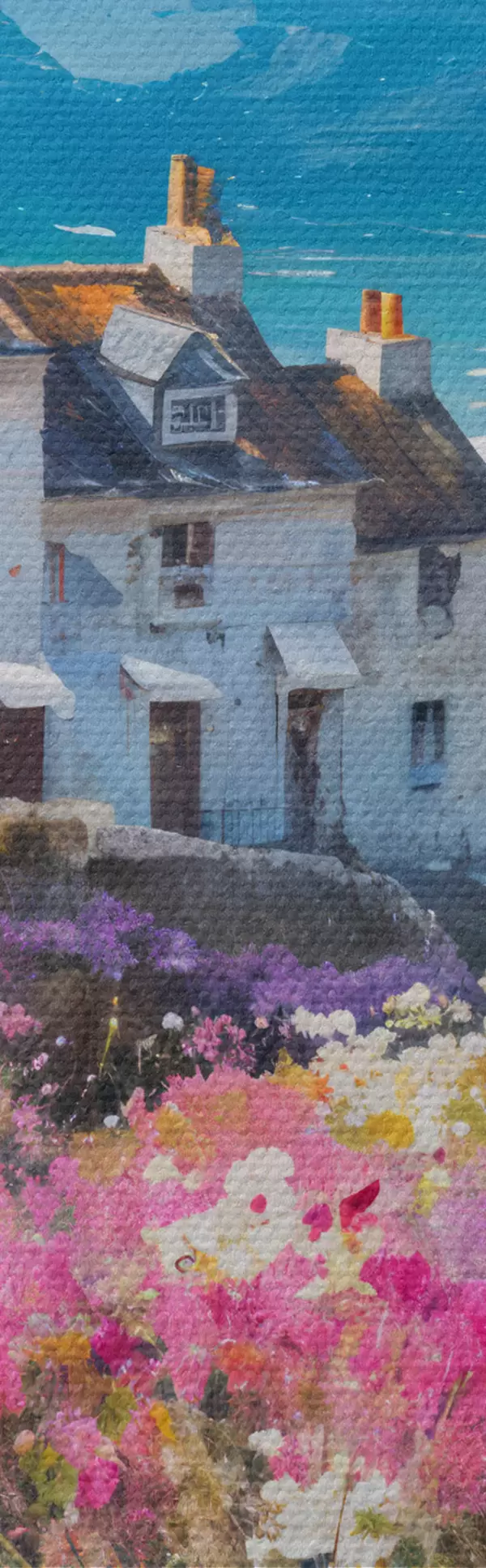 carta da parati Una colorata città costiera dipinta a olio con case bianche e un vivace giardino fiorito in primo piano nr. s41090