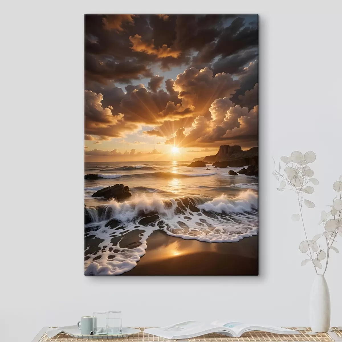 Quadri Un tramonto drammatico su una costa rocciosa, con onde che si infrangono e nuvole drammatiche nel cielo Nr s41245
