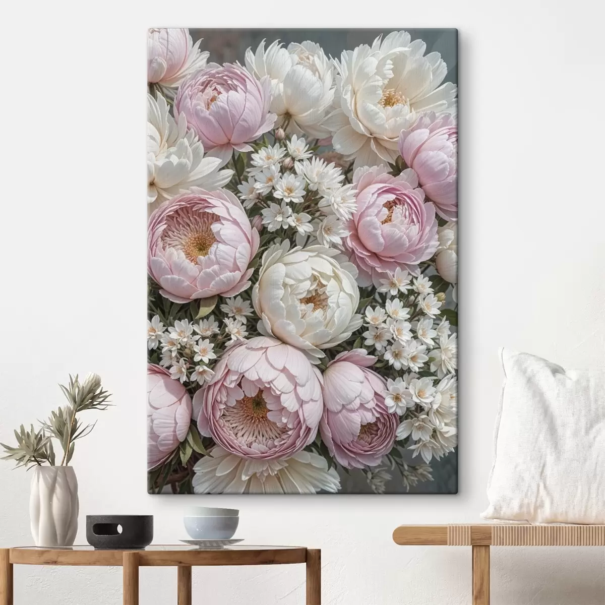 Quadri Un bouquet di peonie rosa pastello e margherite bianche, disposte in una bella composizione floreale Nr s41255