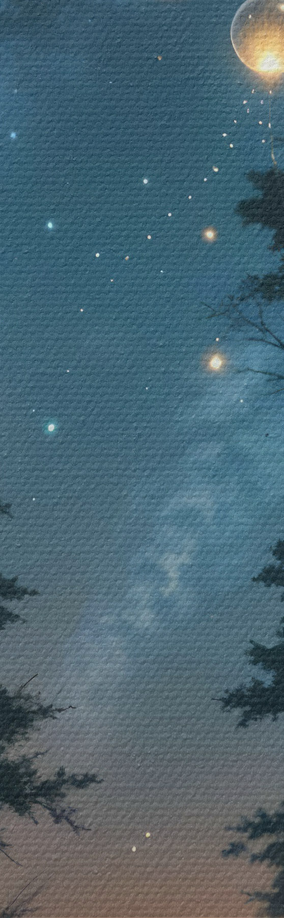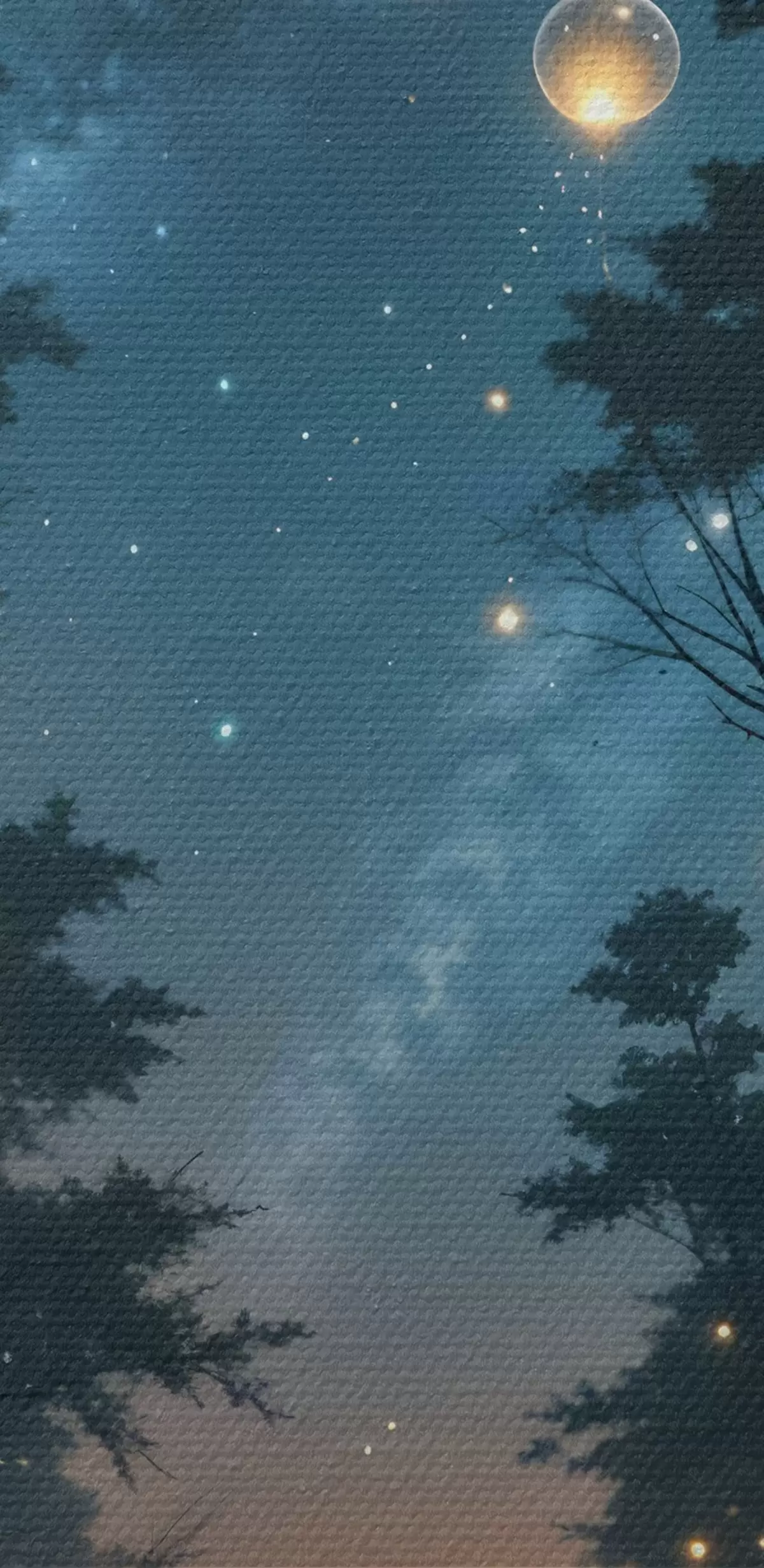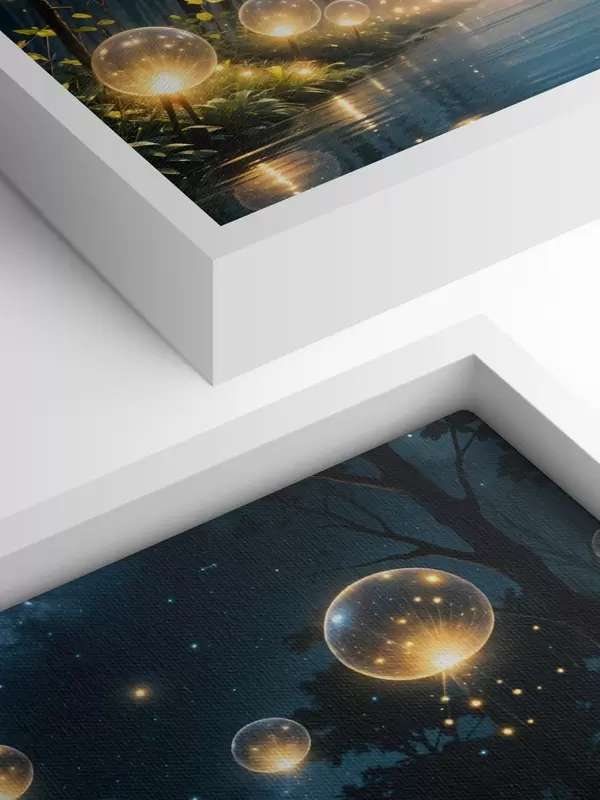 Quadri Una foresta magica di notte, con sfere gialle e lucciole che fluttuano tra gli alberi, creando un'atmosfera stravagante Nr s41259