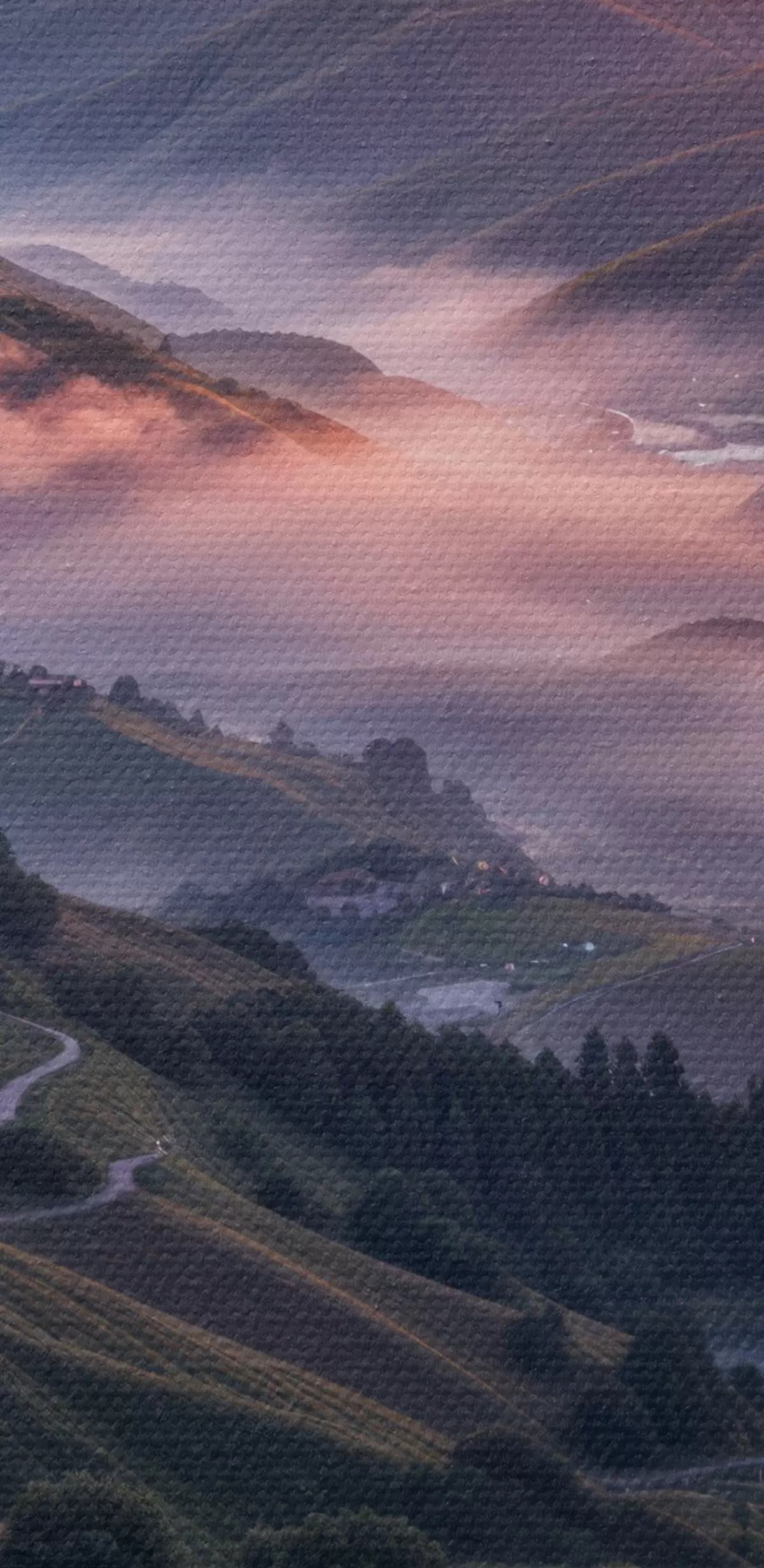 Quadri Un paesaggio mozzafiato con un tramonto vibrante su una regione montuosa con grappoli di fiori rosa Nr s41263