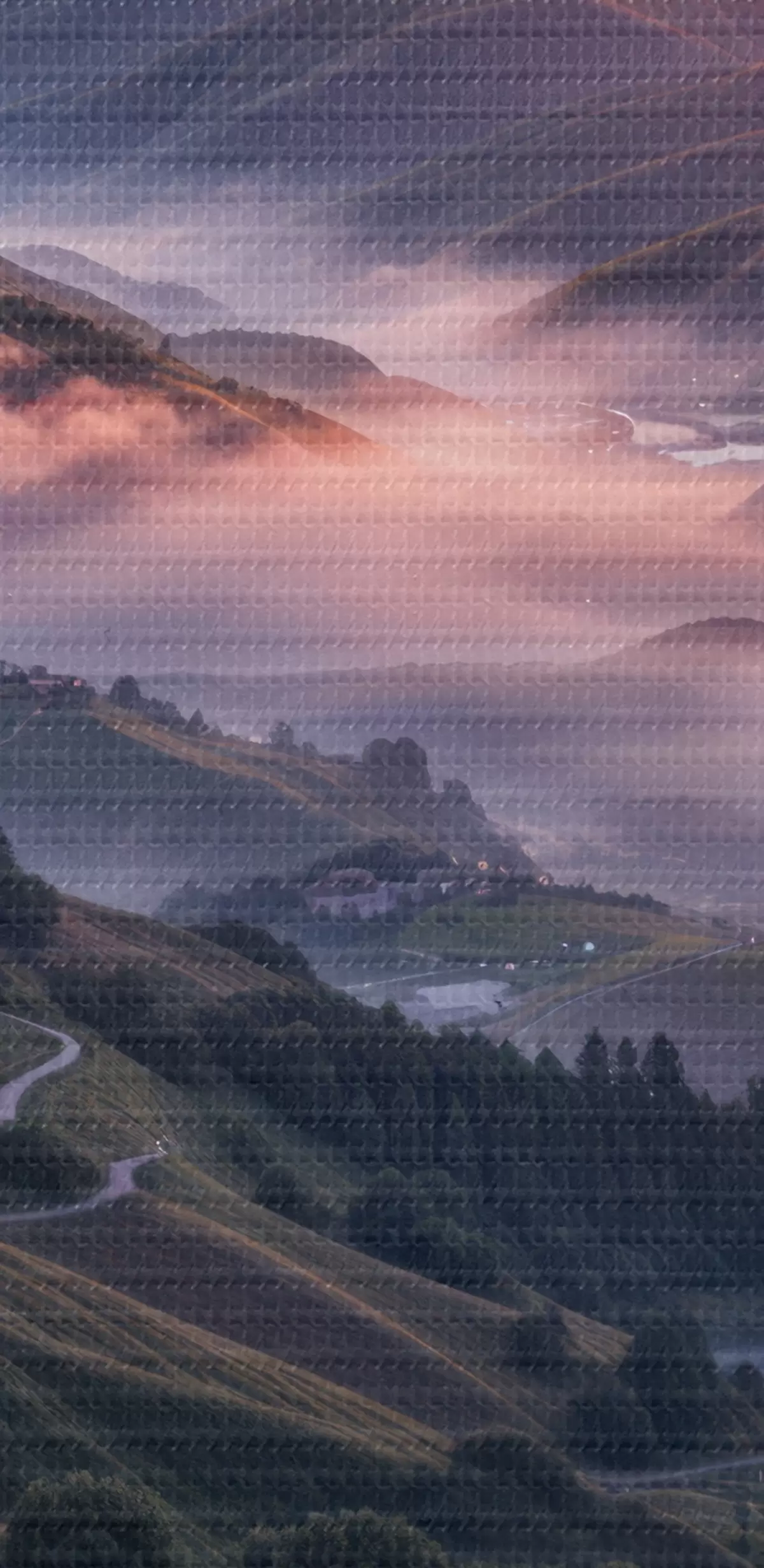 carta da parati Un paesaggio mozzafiato con un tramonto vibrante su una regione montuosa con grappoli di fiori rosa nr. s41263