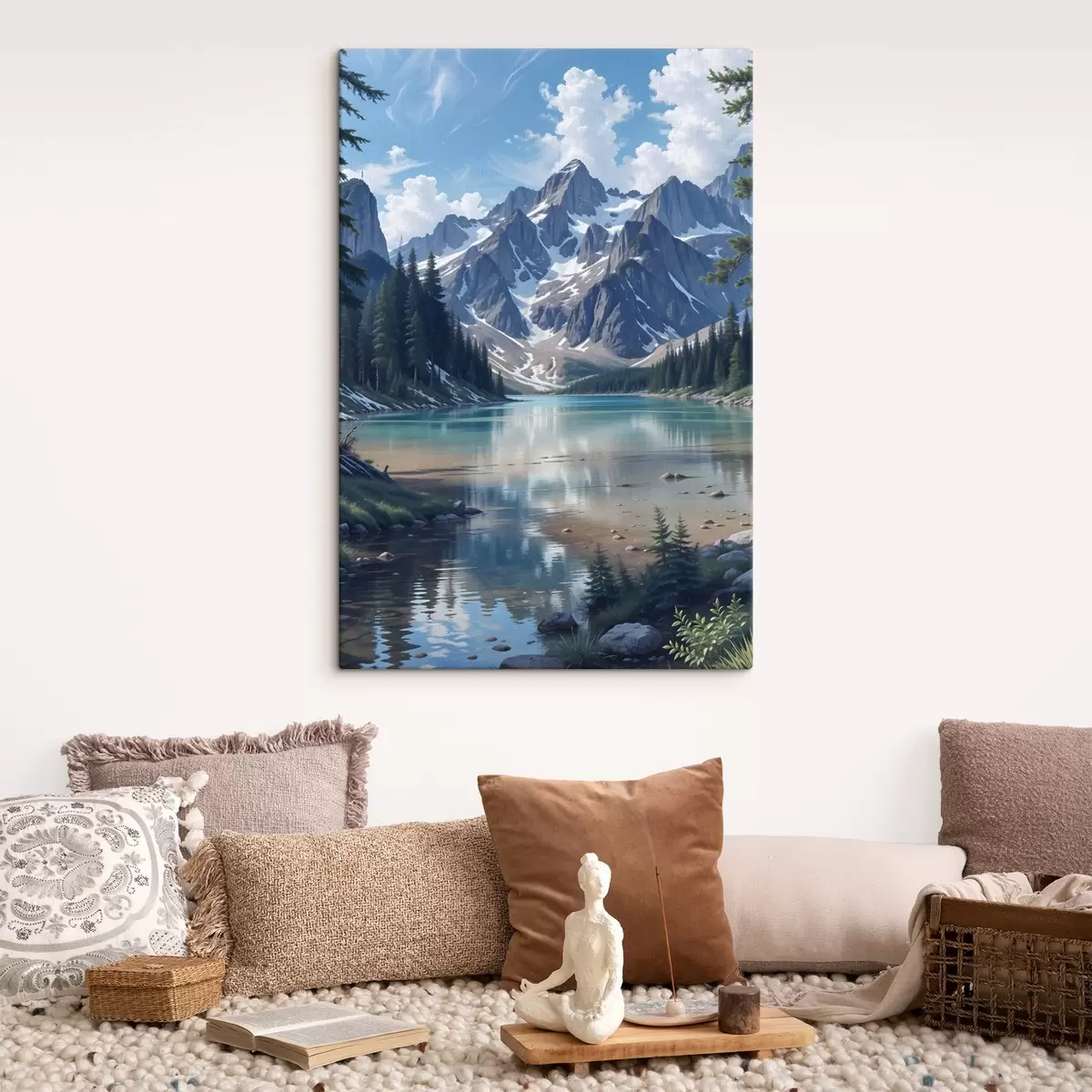 Quadri Un lago alpino sereno, circondato da maestose montagne innevate, con una fitta foresta e un cielo nuvoloso Nr s41264