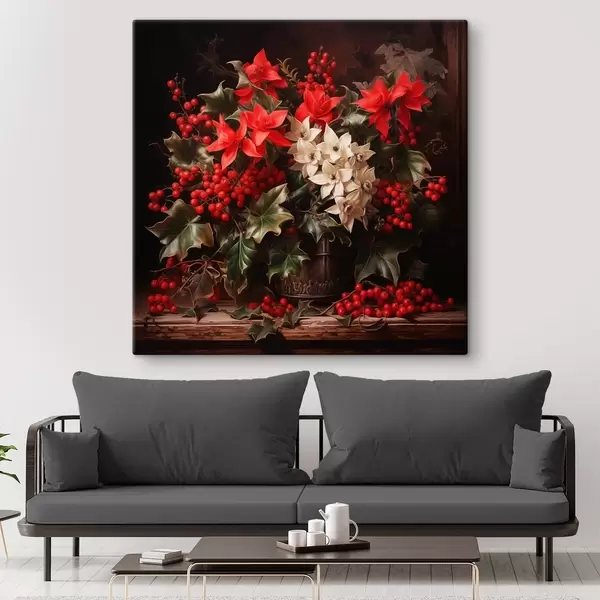 Quadri Bouquet con agrifoglio e fiori di Natale su sfondo scuro Nr s41272