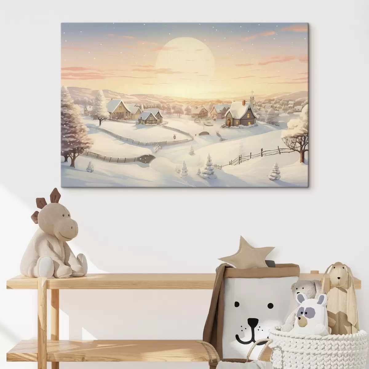 Quadri Villaggio invernale al tramonto, case coperte di neve e pini Nr s41380