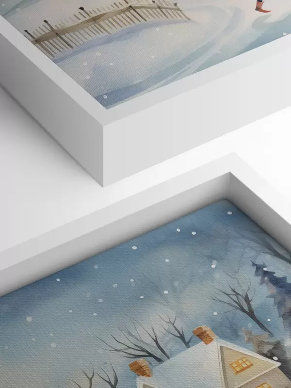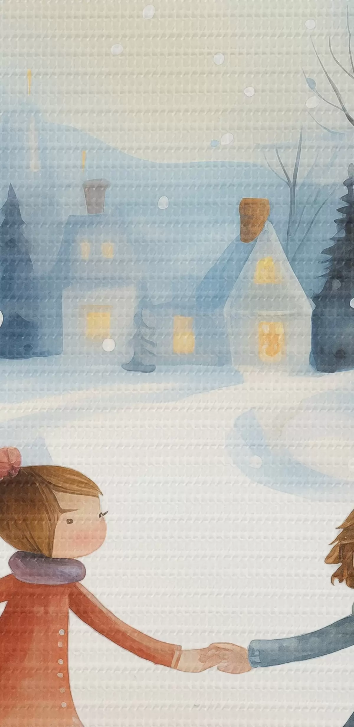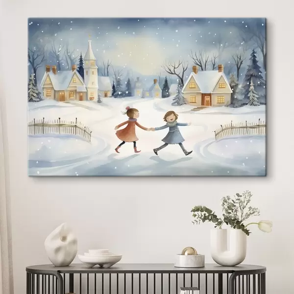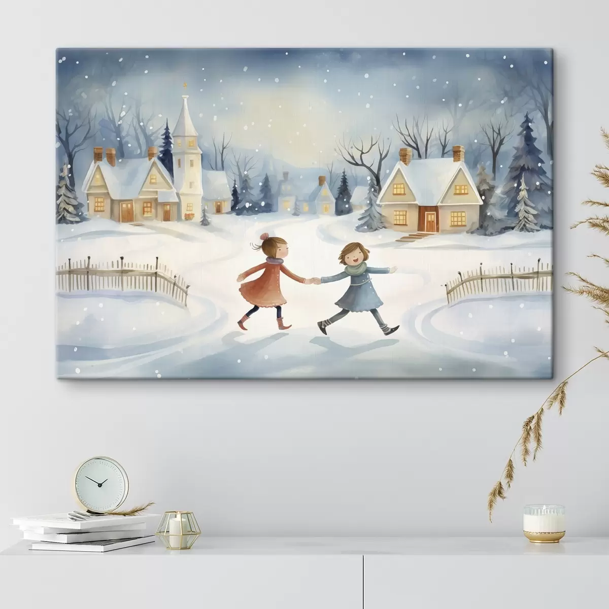 Quadri Ragazze nel villaggio invernale, fiocchi di neve, acquerello, case, foresta Nr s41385