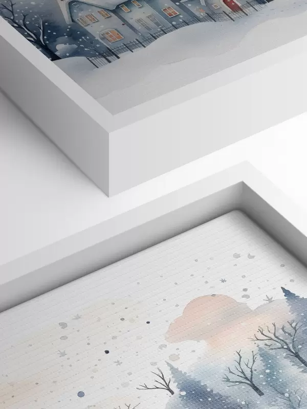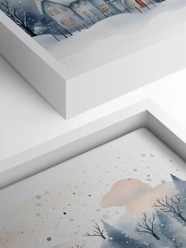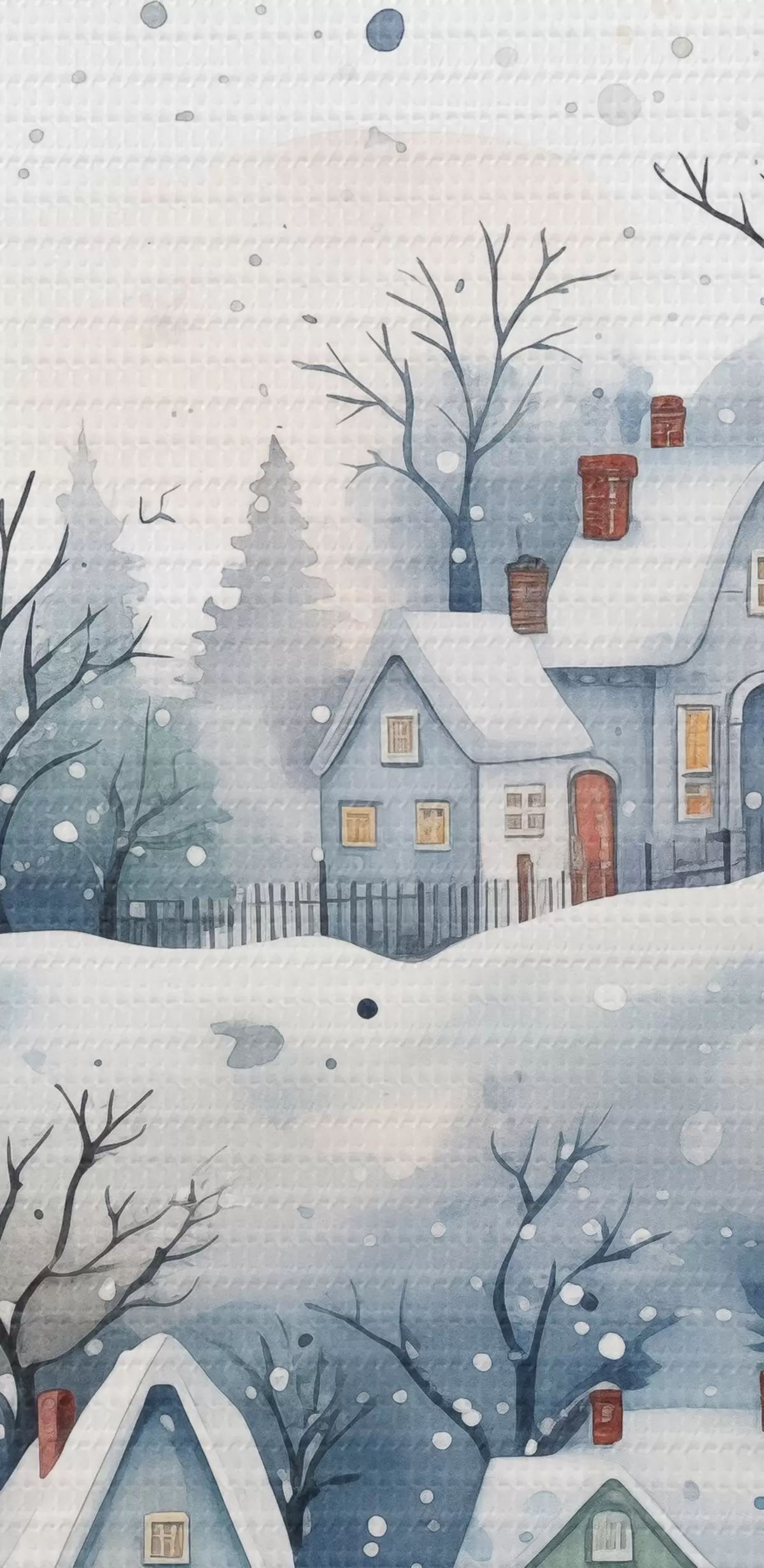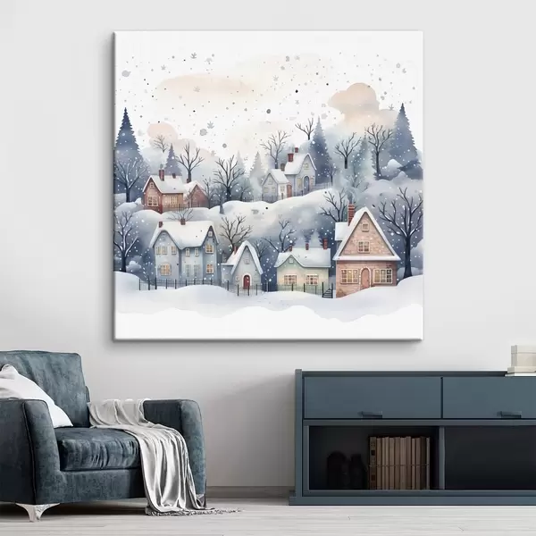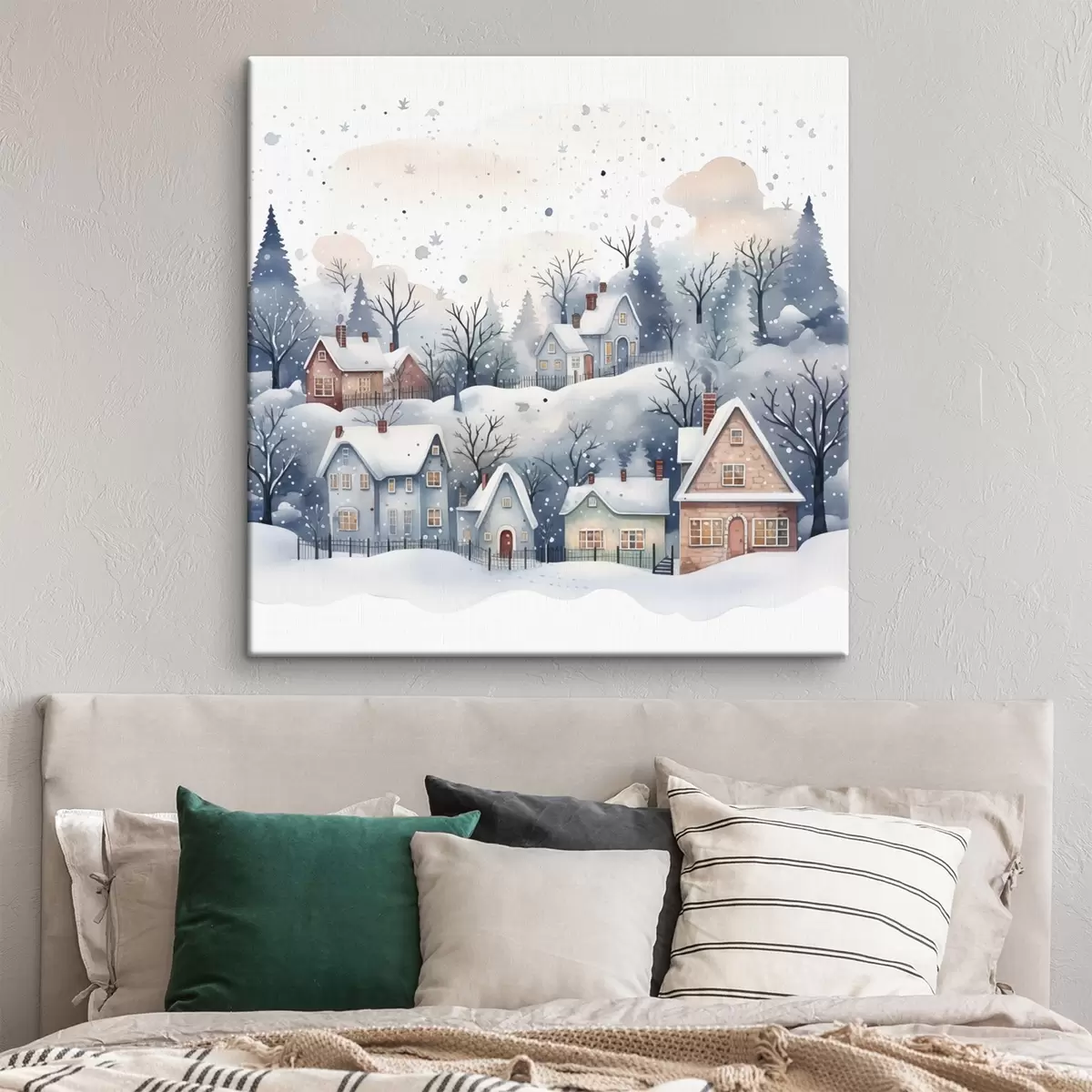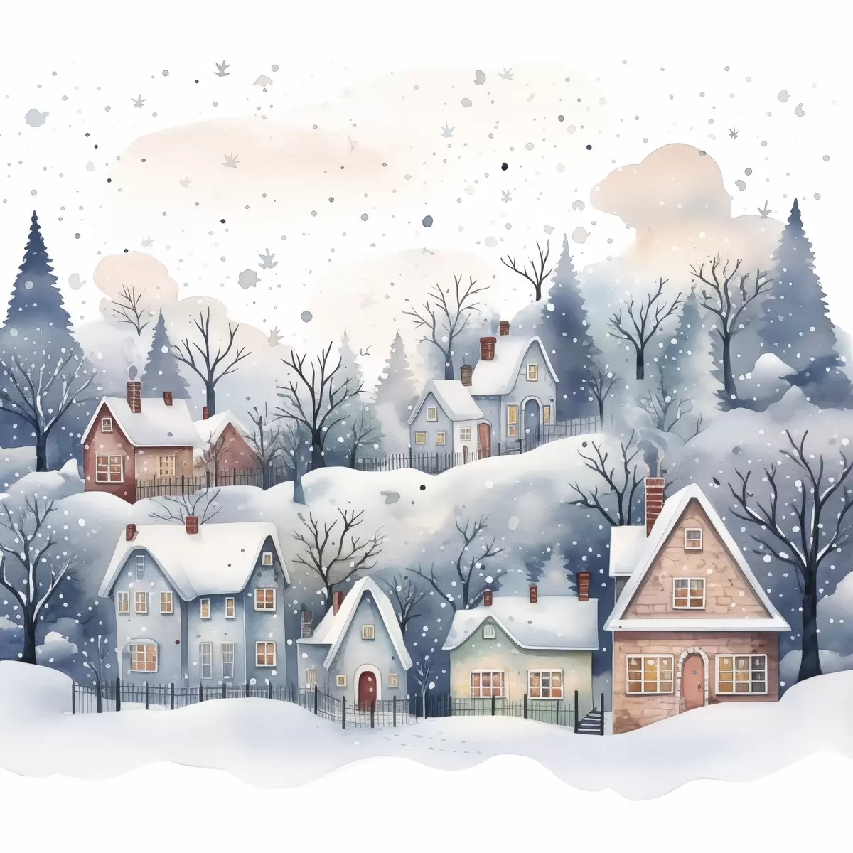 Quadri Paesaggio invernale acquerellato con case e pineta Nr s41389