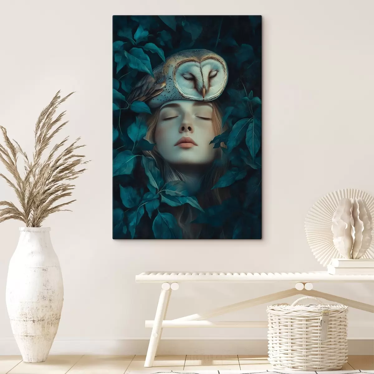 Quadri Donna con gufo tra le foglie verdi, pace, natura Nr s41445