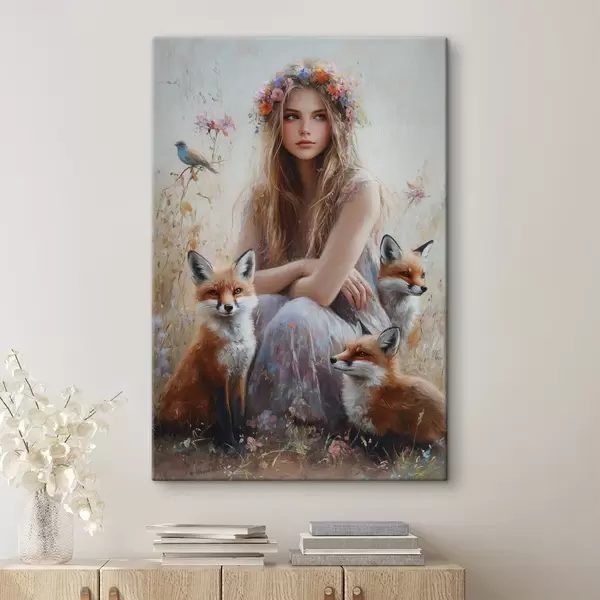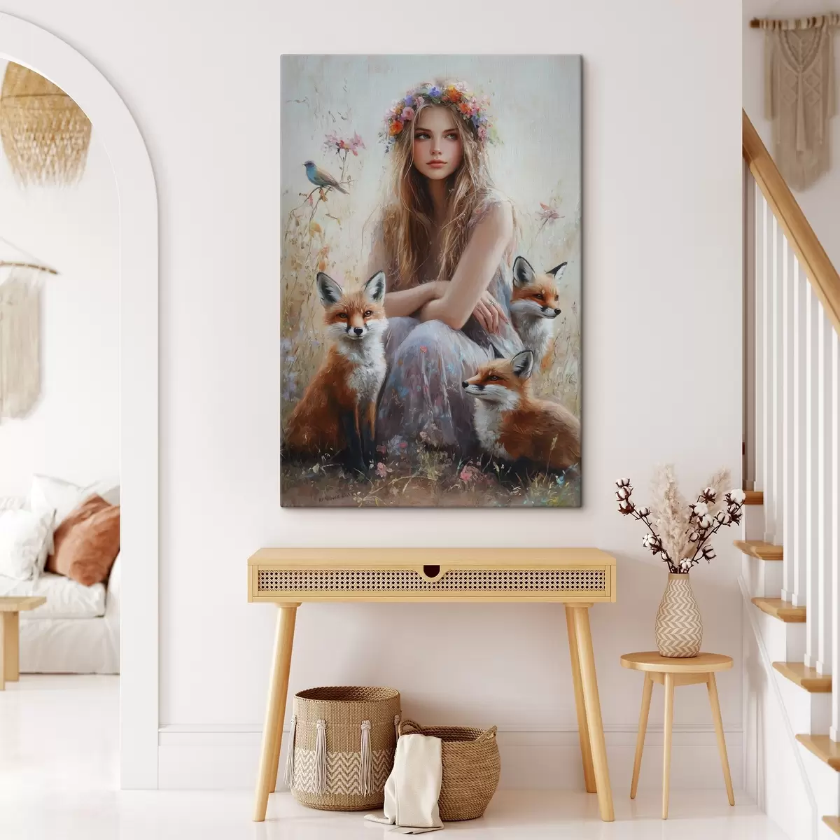 Quadri Ragazza nel prato, animali selvatici, volpi, uccelli, ghirlanda floreale Nr s41451