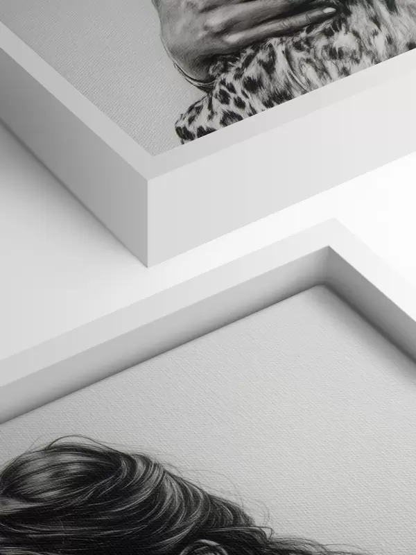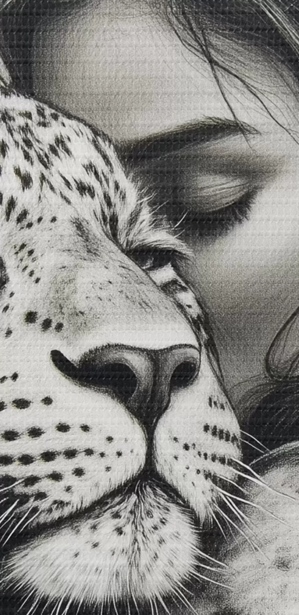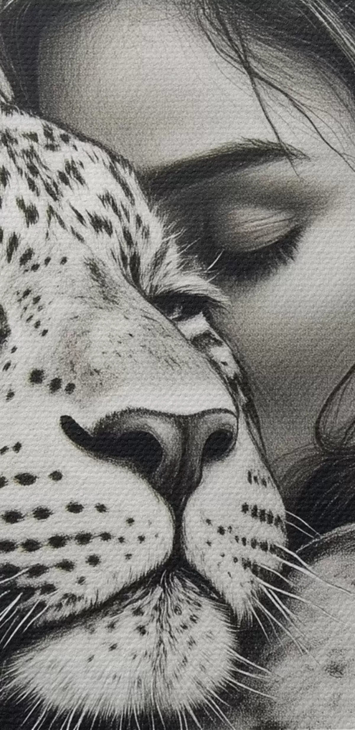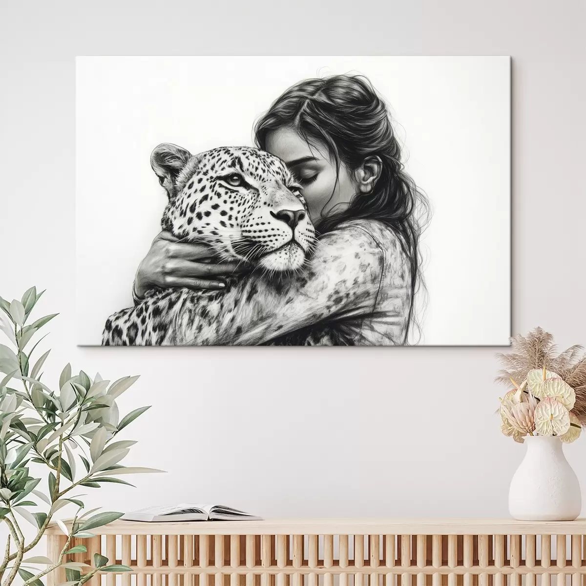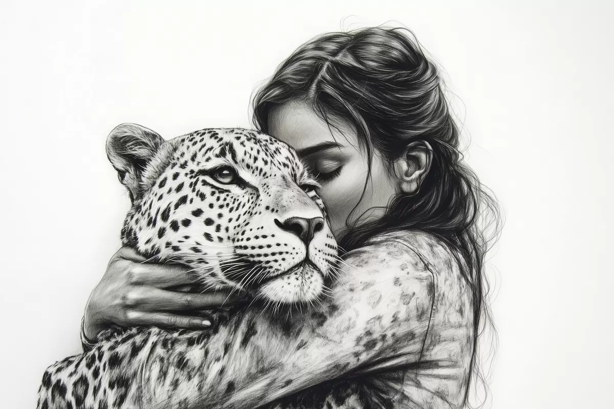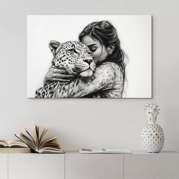 Quadri Donna con leopardo, animali selvatici, disegno a matita, bianco e nero Nr s41455