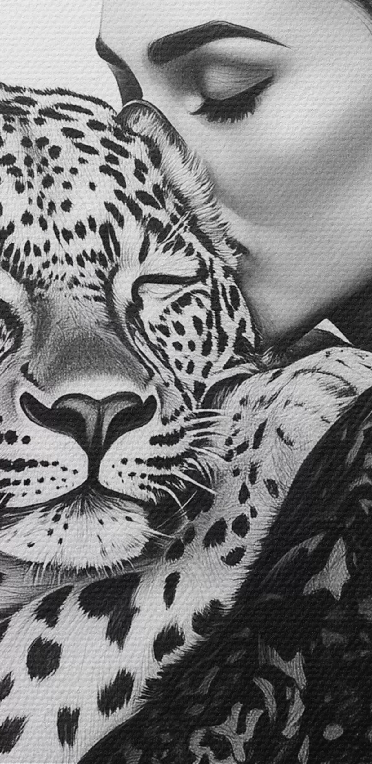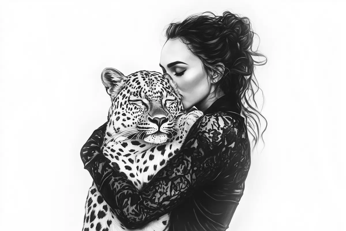 carta da parati Donna che bacia il leopardo, disegno a matita, animali selvatici, bianco e nero nr. s41457