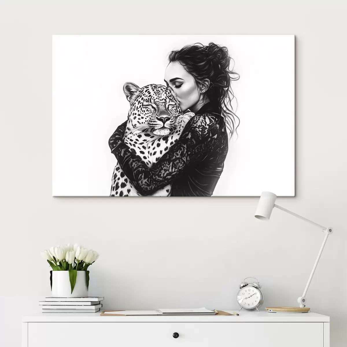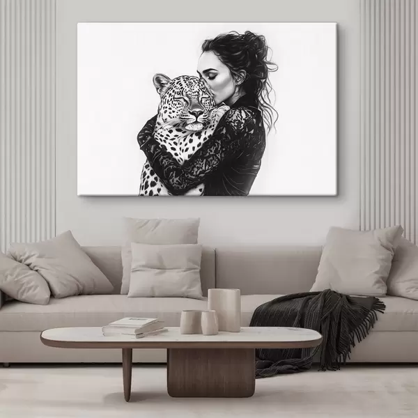 Quadri Donna che bacia il leopardo, disegno a matita, animali selvatici, bianco e nero Nr s41457