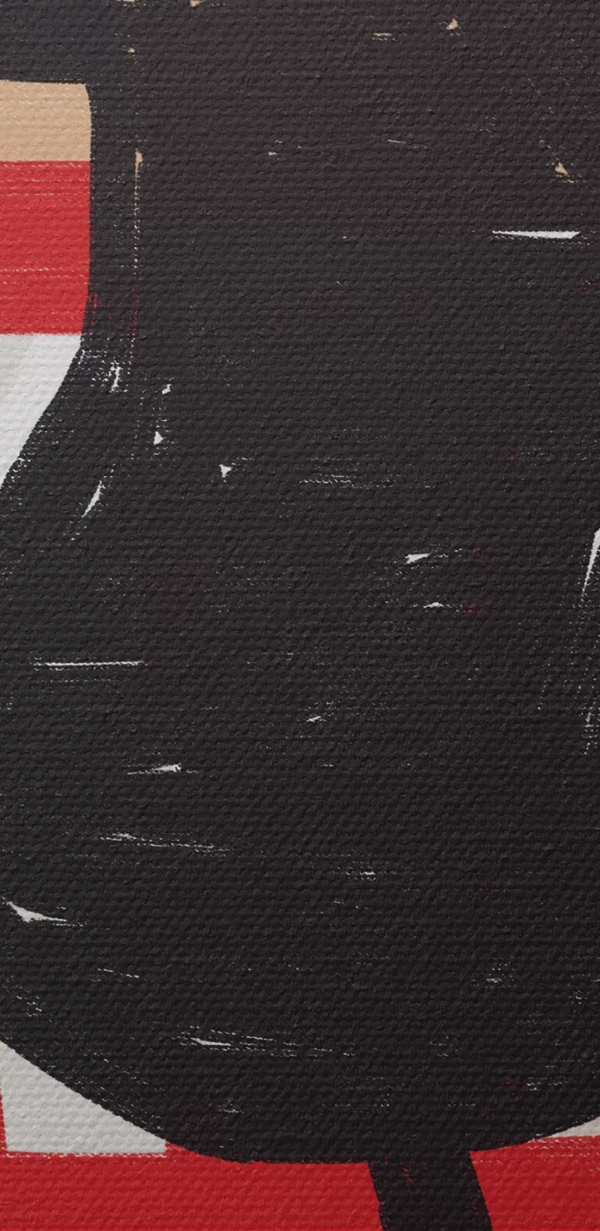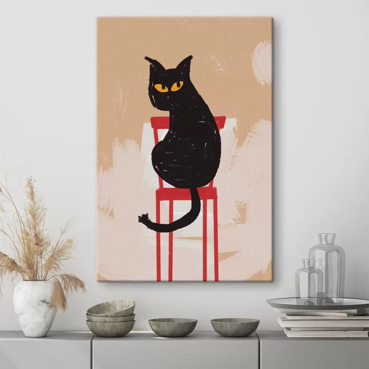 Quadri Gatto nero seduto su sedia rossa su sfondo beige, tratti grezzi, imitazione di pittura Nr s41612