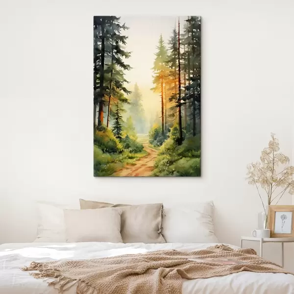 Quadri Bellissima foresta acquerellata con pini e luce delicata del sole Nr s41637