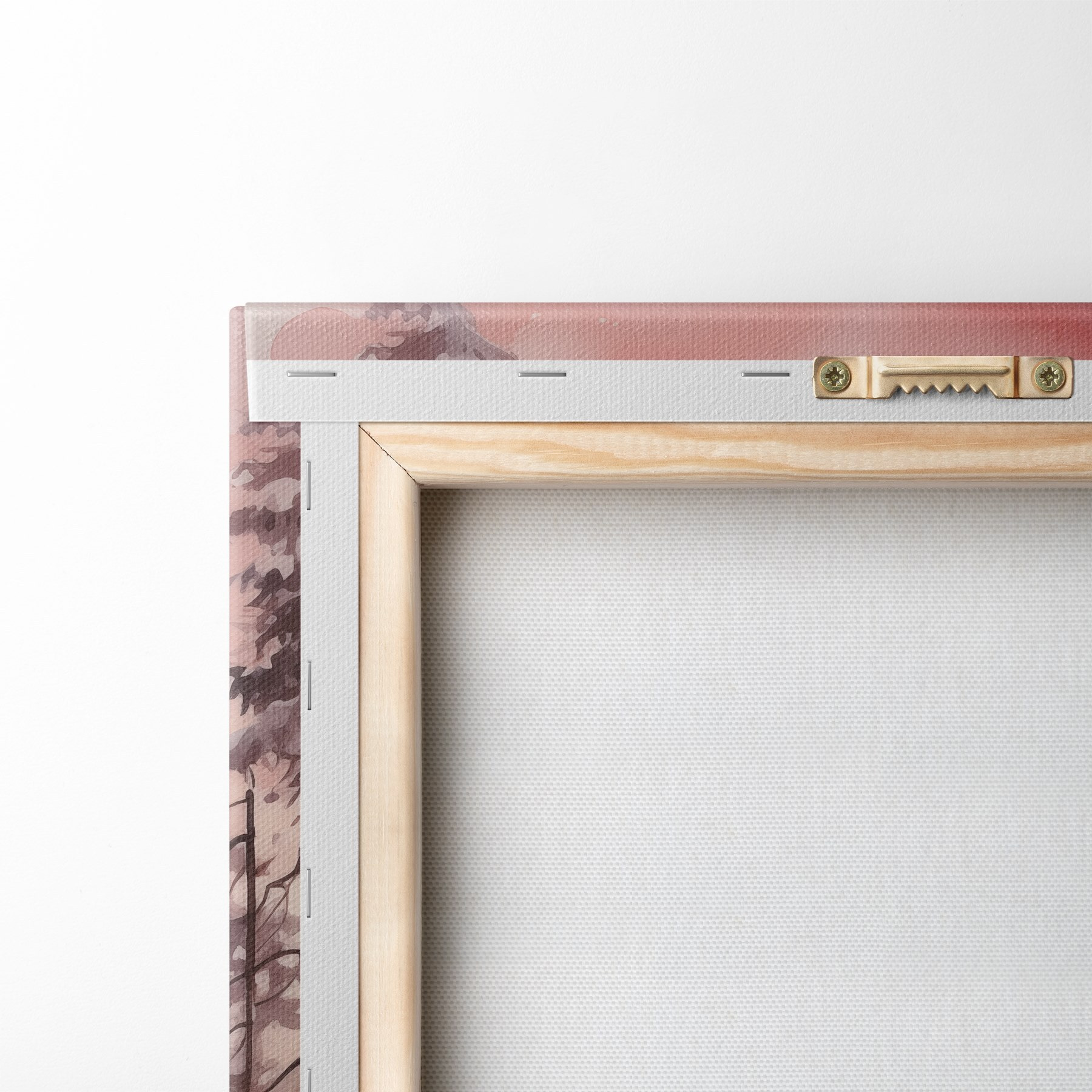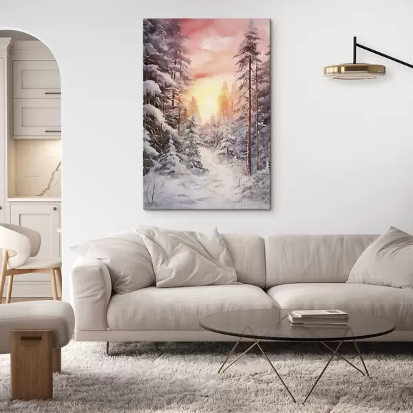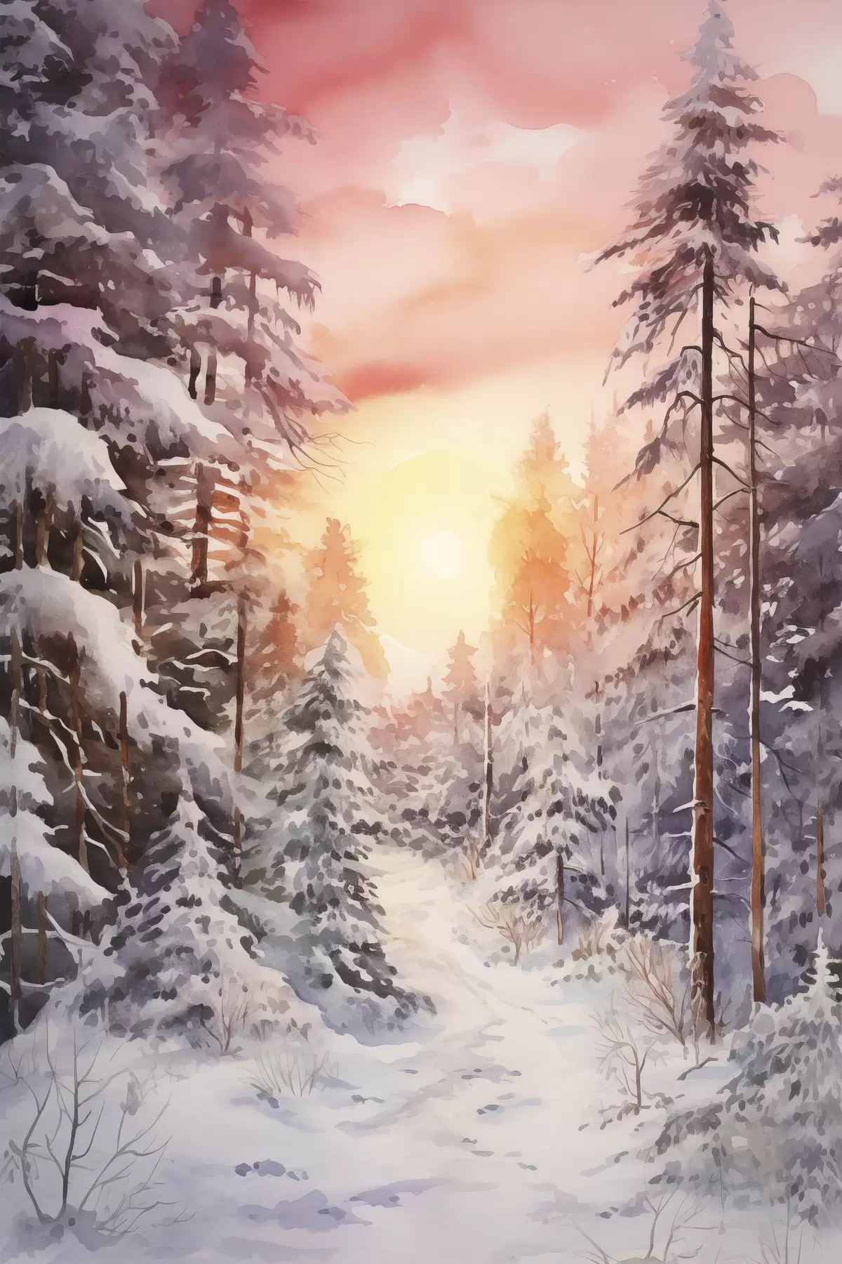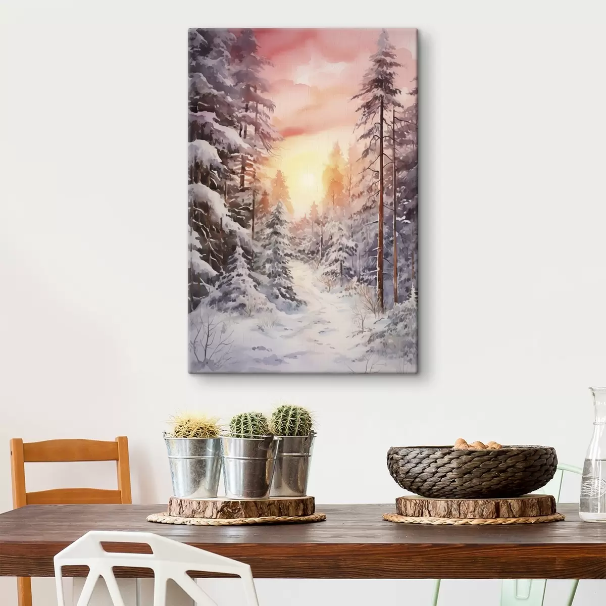 Quadri Bellissimo inverno, acquerello foresta, innevato, alberi, cielo rosa, tramonto Nr s41641
